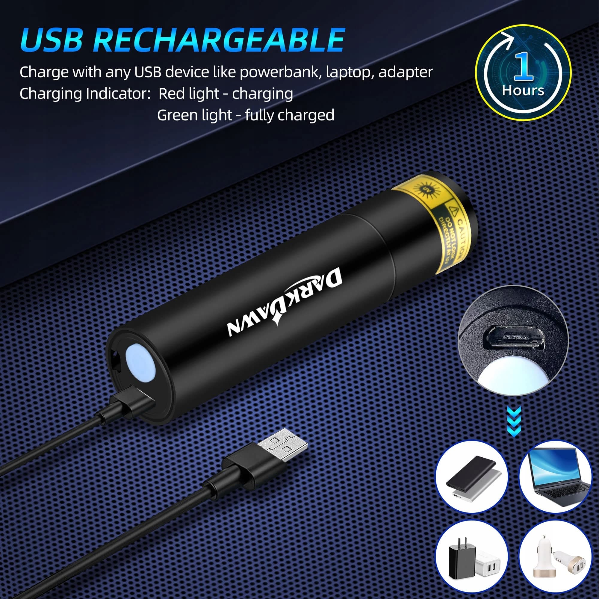 DARKDAWN UV Latarka 365nm światło, czarne światło mini ładowalne, przenośna lampa LED ultrafioletowa 370nm detektor moczu zwierząt domowych, plam, pieniędzy, bursztynu, wykrywanie wycieków, z filtrem UV