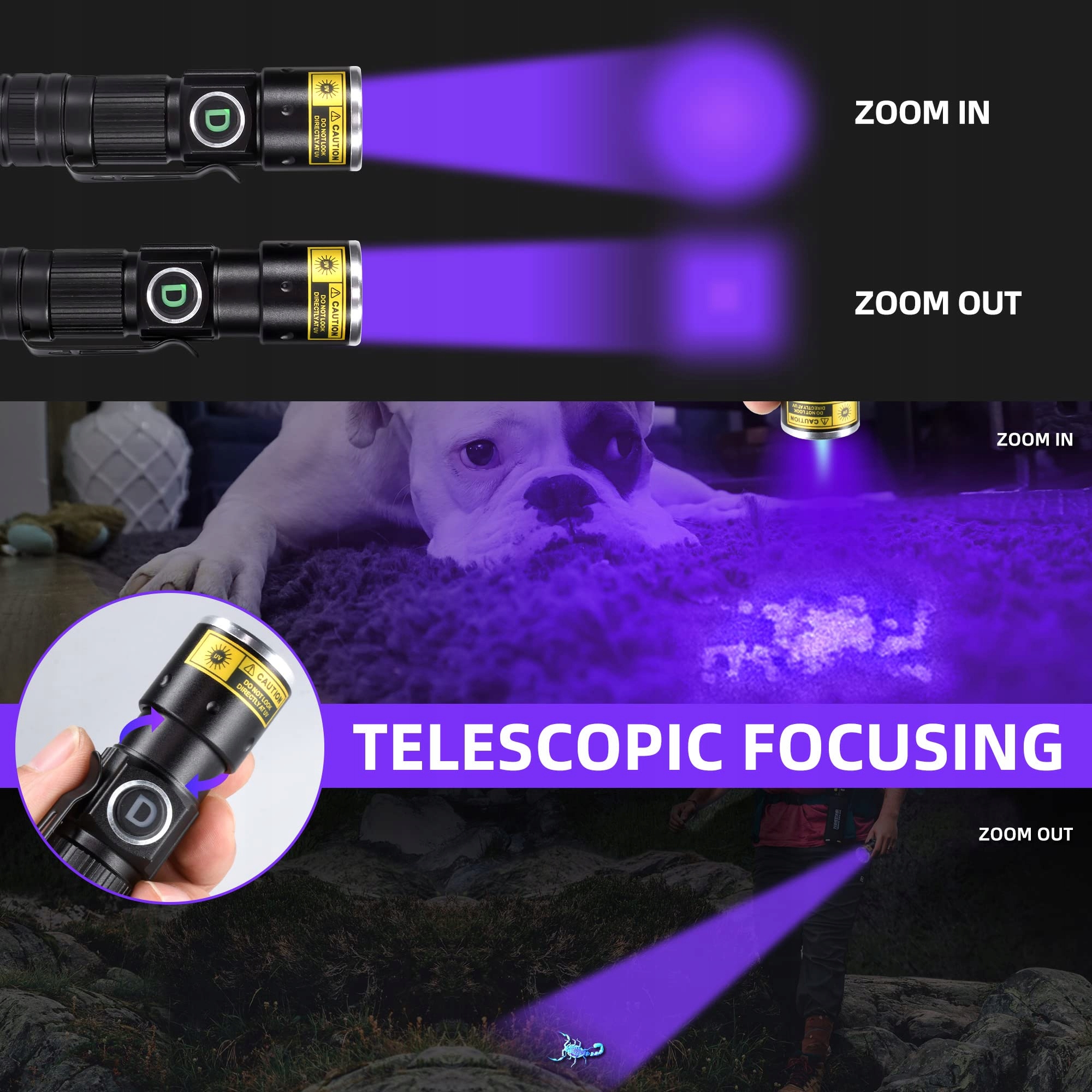 DARKDAWN Latarki UV 395nm światło USB ładowalna, ultrafioletowa latarka LED czarne światło mini latarka leśna z zoomem, detektor moczu zwierzęcego, bursztynu, szkła uranowego, utwardzania żywicy, 2 sztuki