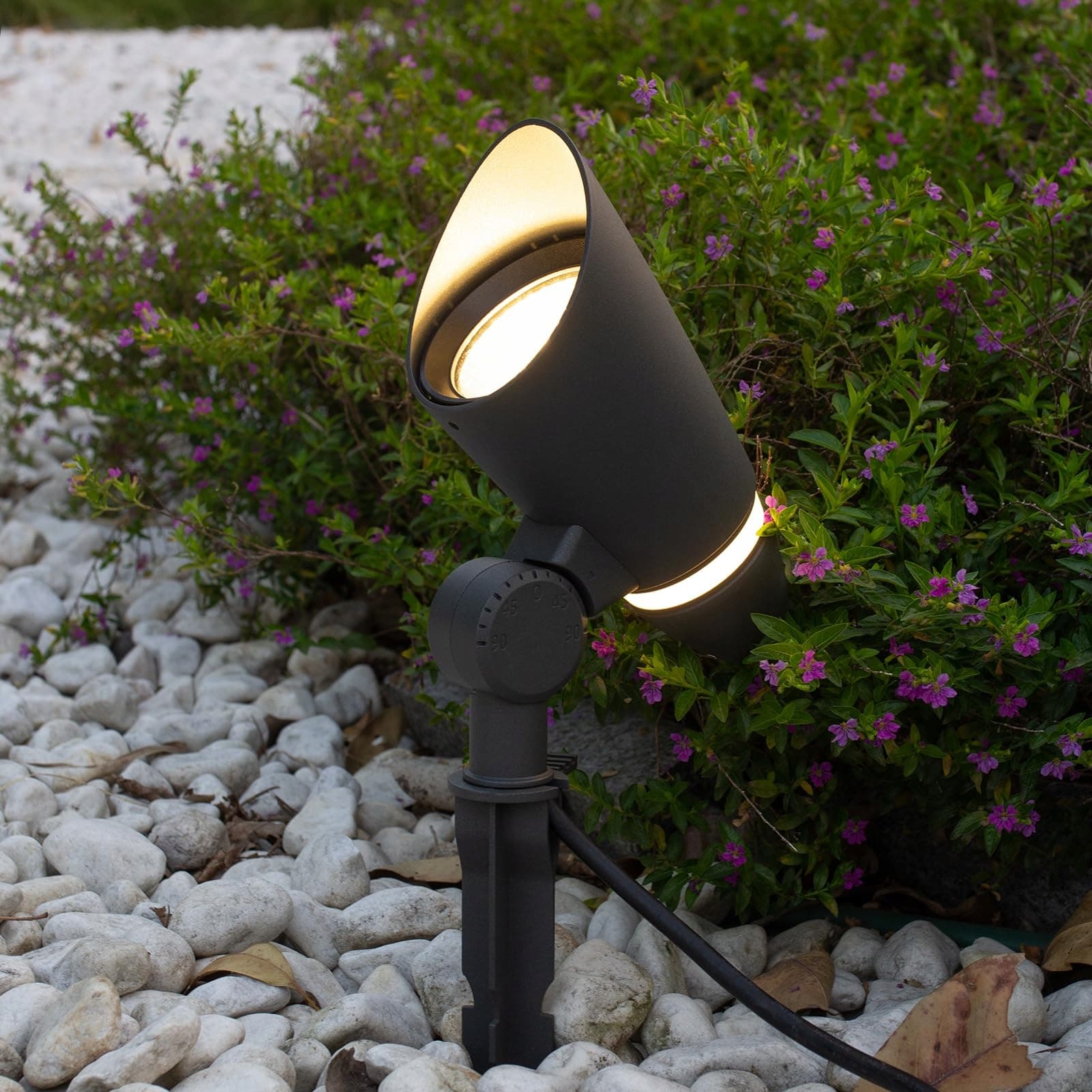 Oświetlenie ogrodowe: Wodoodporne lampy z kolcem o klasie IP65 - lampy z wodoodporną skrzynką połączeniową IP68, umożliwiające użycie na zewnątrz bez potrzeby dodatkowych zabezpieczeń i przedłużenia kabla.