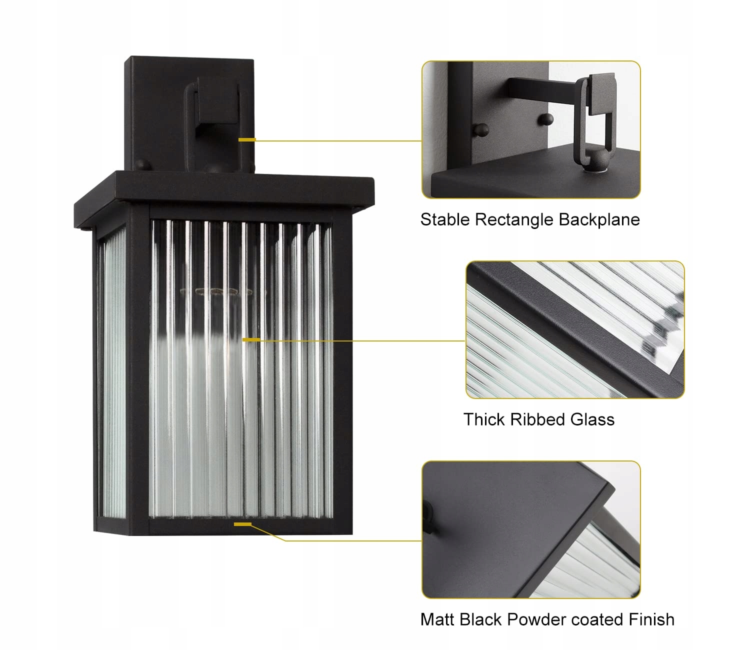 DAWALIGHT Lampa ścienna na zewnątrz z ryflowanym szkłem Lampa ścienna prostokątna Lampa zewnętrzna E27 lampa ścienna na zewnątrz do salonu ogrodu ściany domu tarasu na zewnątrz, czarna, metal antykorozyjny