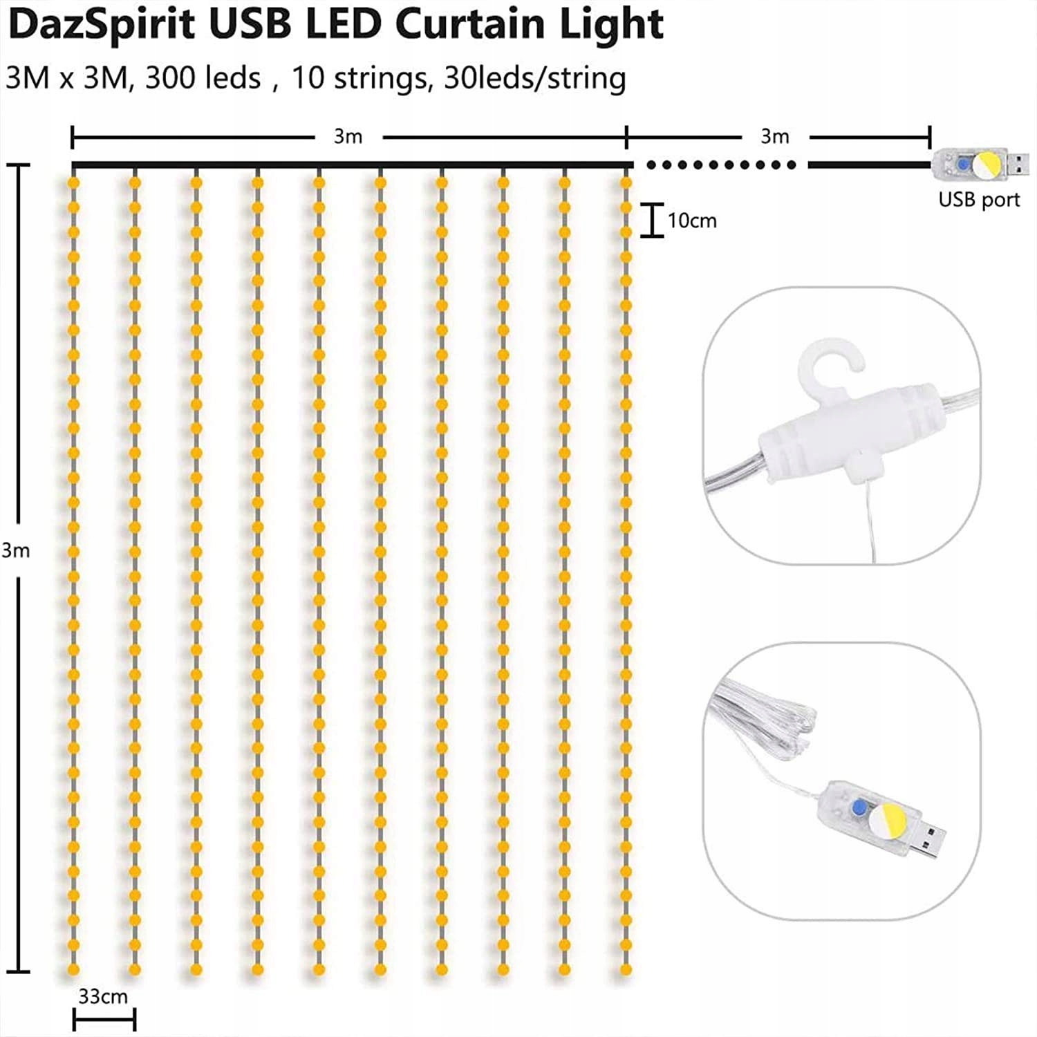 DazSpirit 3Mx3M 300 LED Lichtervorhang, USB Lichterkette Vorhang wewnątrz Dekoracyjny z 8 trybami świetlnymi, pilotem i funkcją timera, wodoodporny na ślub Boże Narodzenie sypialnię (Biały)