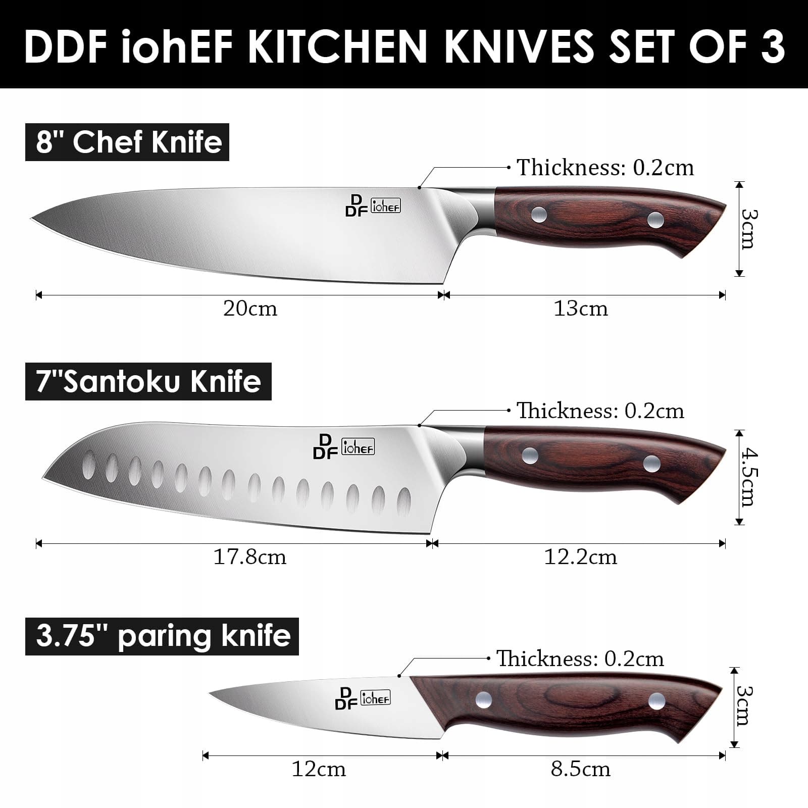 【Wszechstronny zestaw noży kuchennych】: 3-częściowy zestaw noży DDF iohEF zawiera ultrastrzałowy nóż kuchenny o długości 8 cali, nóż Santoku o długości 7 cali oraz nóż do obierania o długości 3,75 cala. Ten zestaw noży można wykorzystać do codziennych zadań kuchennych i spełnia wszystkie Twoje wymagania.