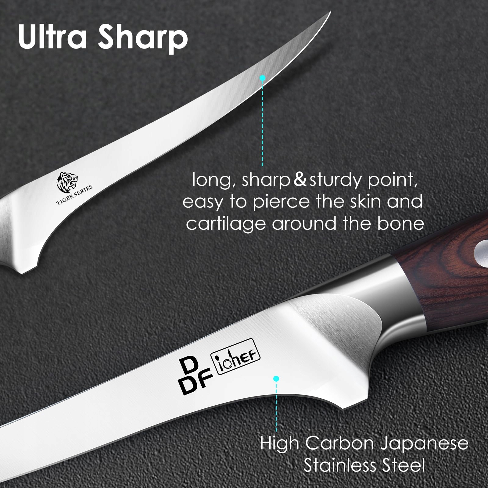【Wyjątkowe wykonanie】: Elastyczny nóż do oddzielania kości ma płaskie ostrze z lekkim zakrzywieniem do ostrego czubka, które służy do łatwego oddzielania mięsa i ryb od kości.