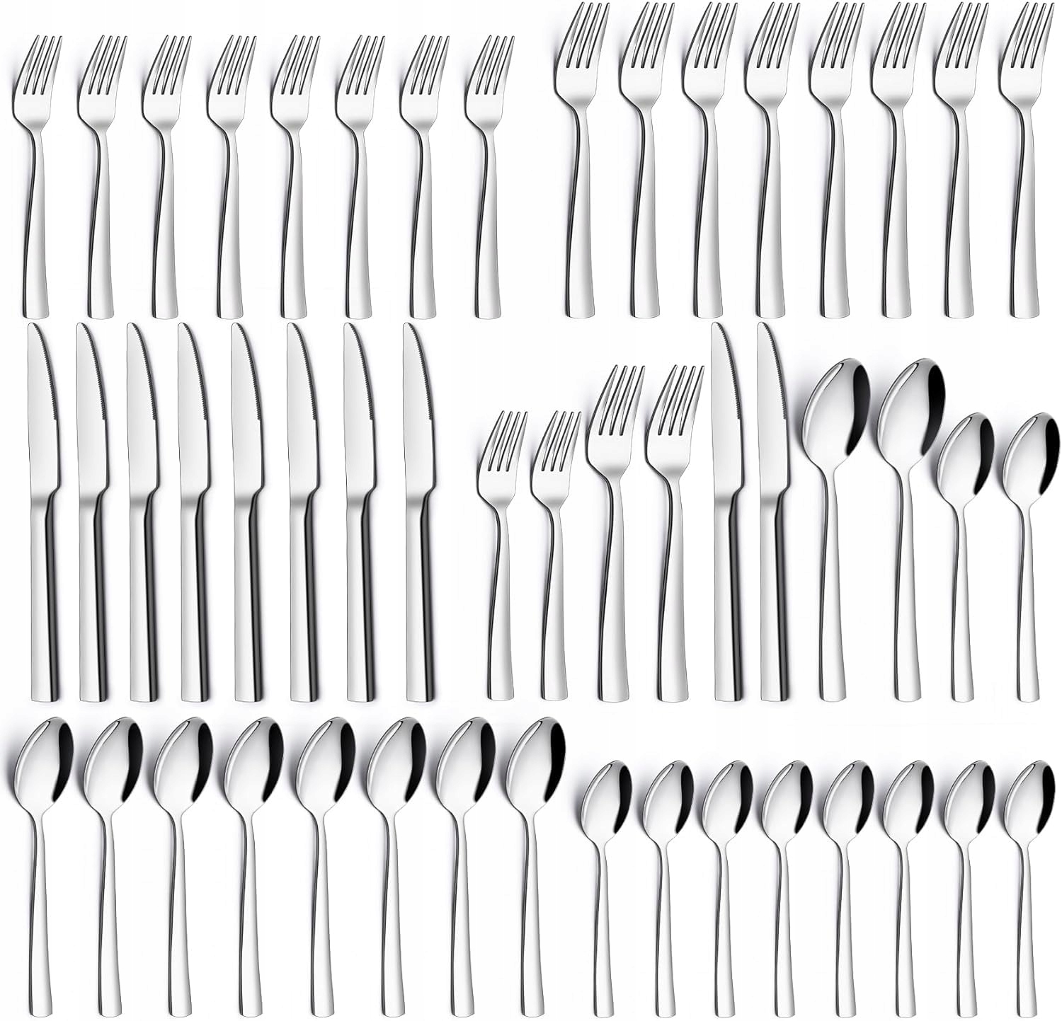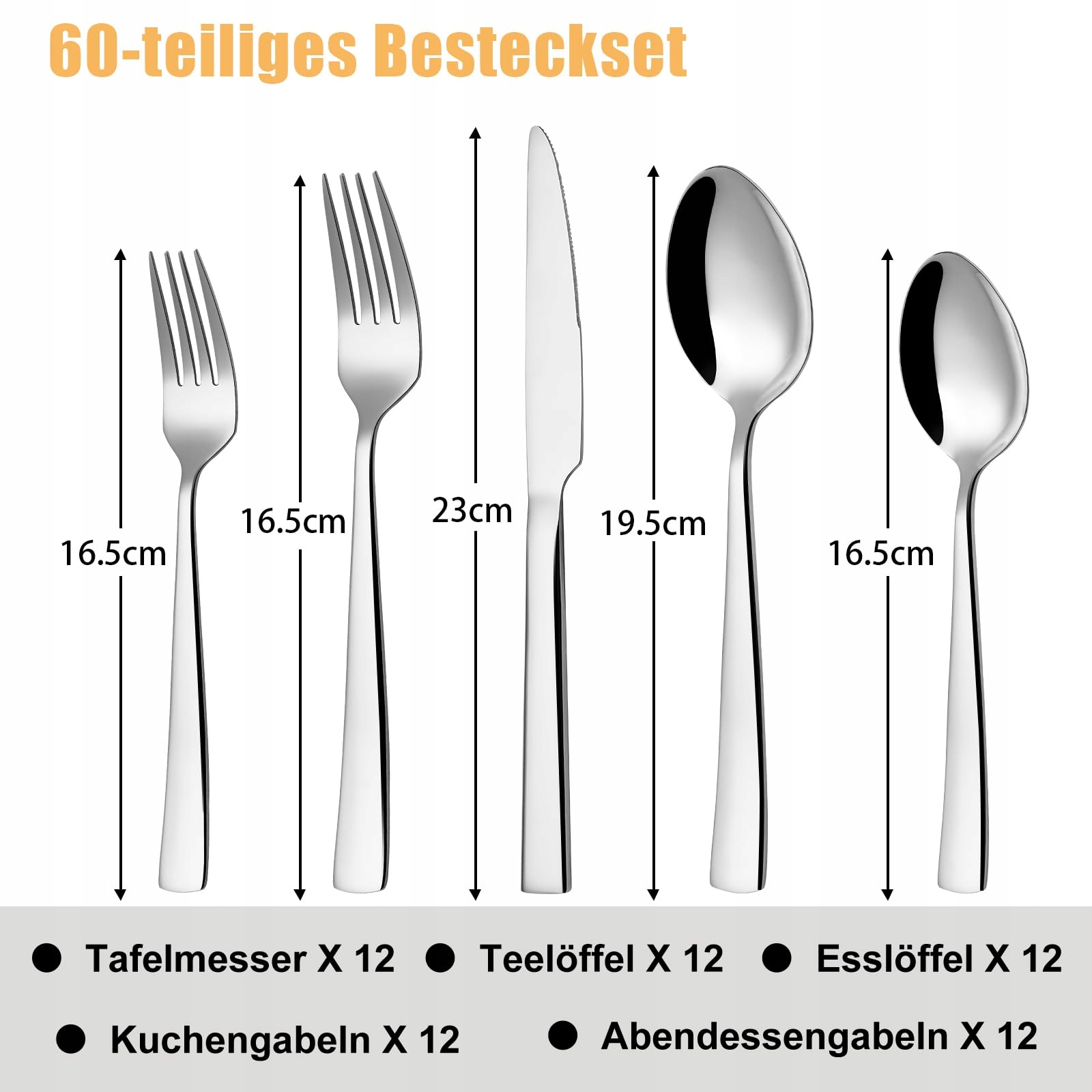 60-elementowy zestaw sztućców dla 12 osób: 60-elementowy zestaw sztućców składający się z 12 widelców, 12 łyżek, 12 widelczyków do sałatek, 12 łyżeczek, 12 noży. Ten srebrny zestaw sztućców spełnia wszystkie Twoje potrzeby związane z jedzeniem