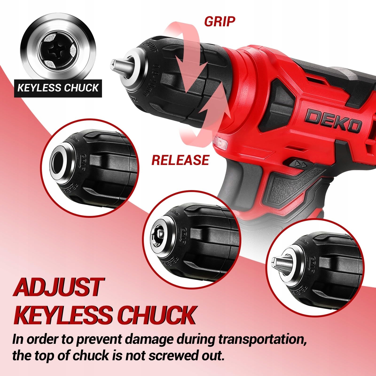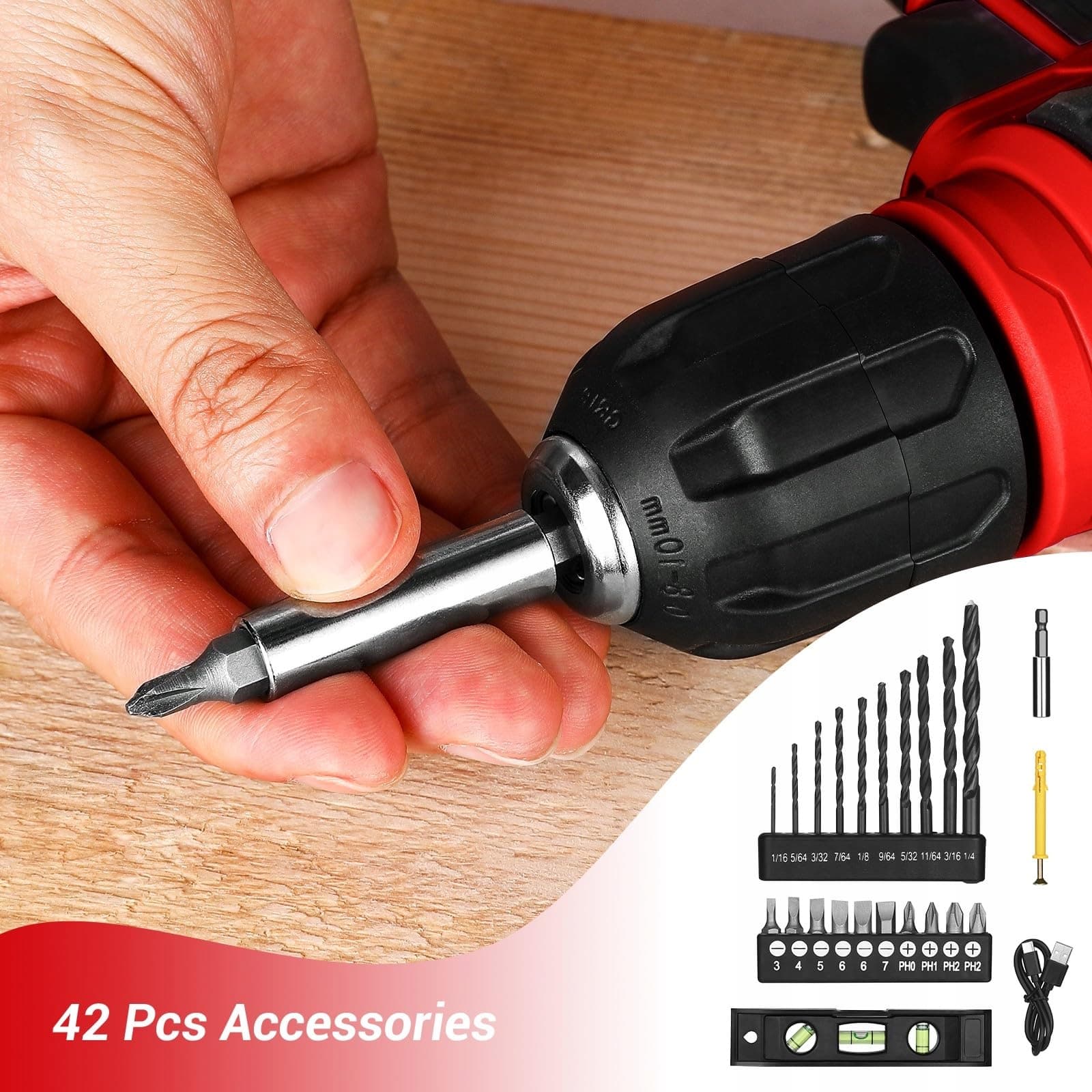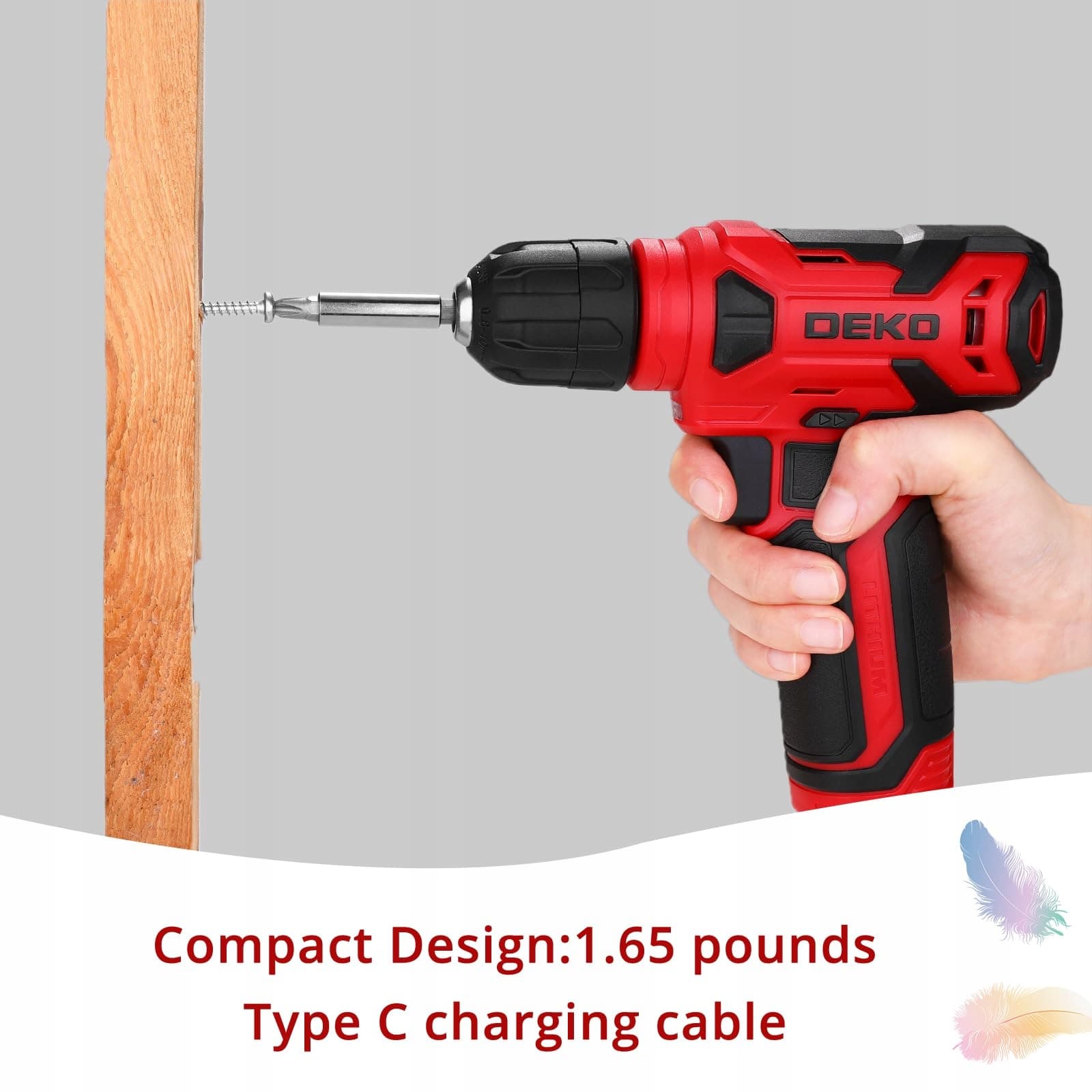 DEKOPRO Wkrętarka akumulatorowa 8 V - Czerwona Wiertarka akumulatorowa do wiercenia i dokręcania/odkręcania śrub, Zestaw bitów z szybkozłączem 3/8 cala (0,95 cm), wbudowana dioda LED, kabel C, 42-elementowy zestaw akcesoriów