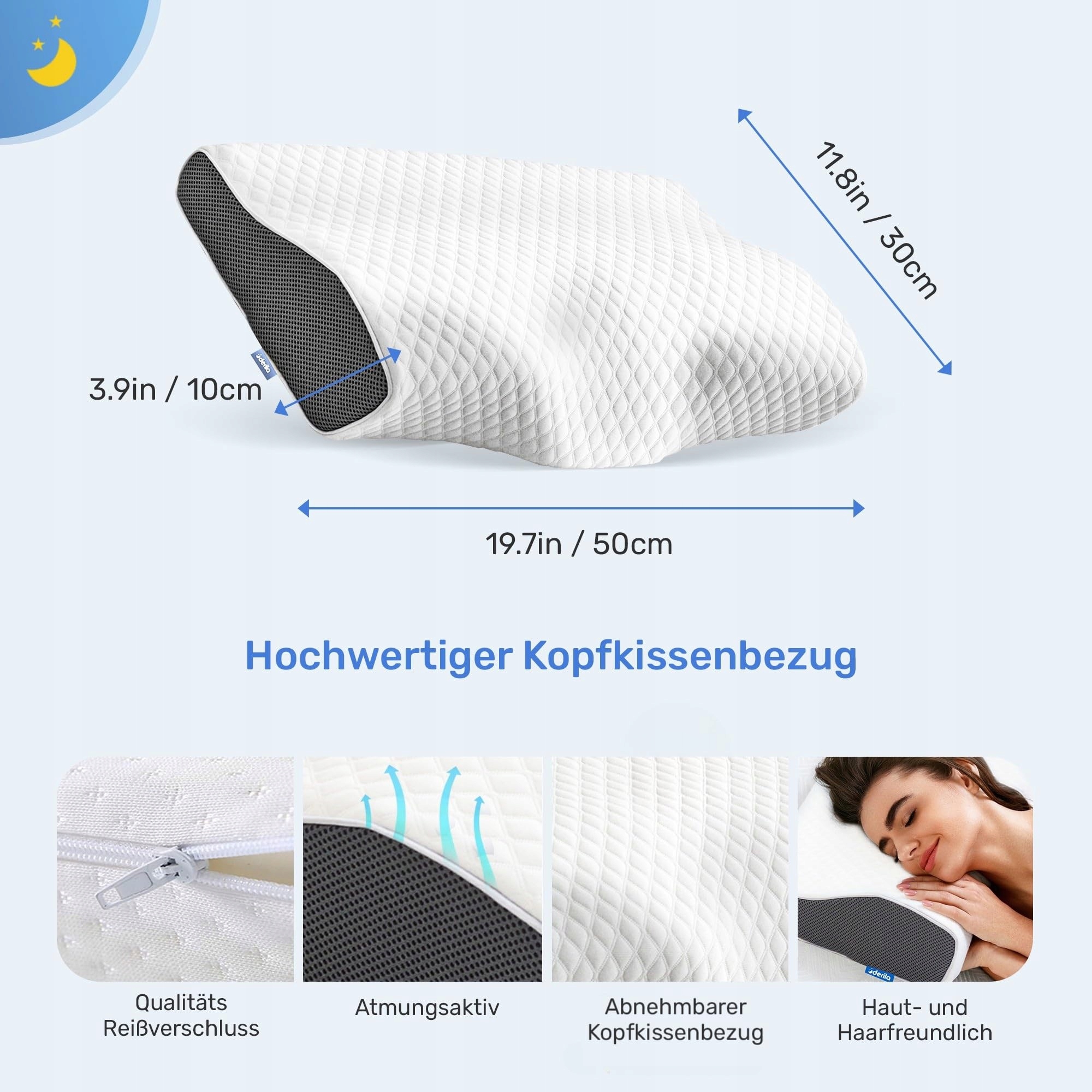 Oddychająca i łatwa w pielęgnacji - Poduszka z pianki memory foam posiada zdejmowany, nadający się do prania w pralce pokrowiec. Oddychające materiały zapewniają przyjemny klimat snu – idealne do domu lub w podróży.