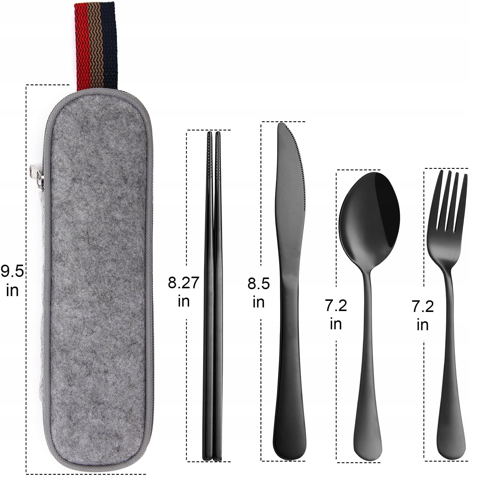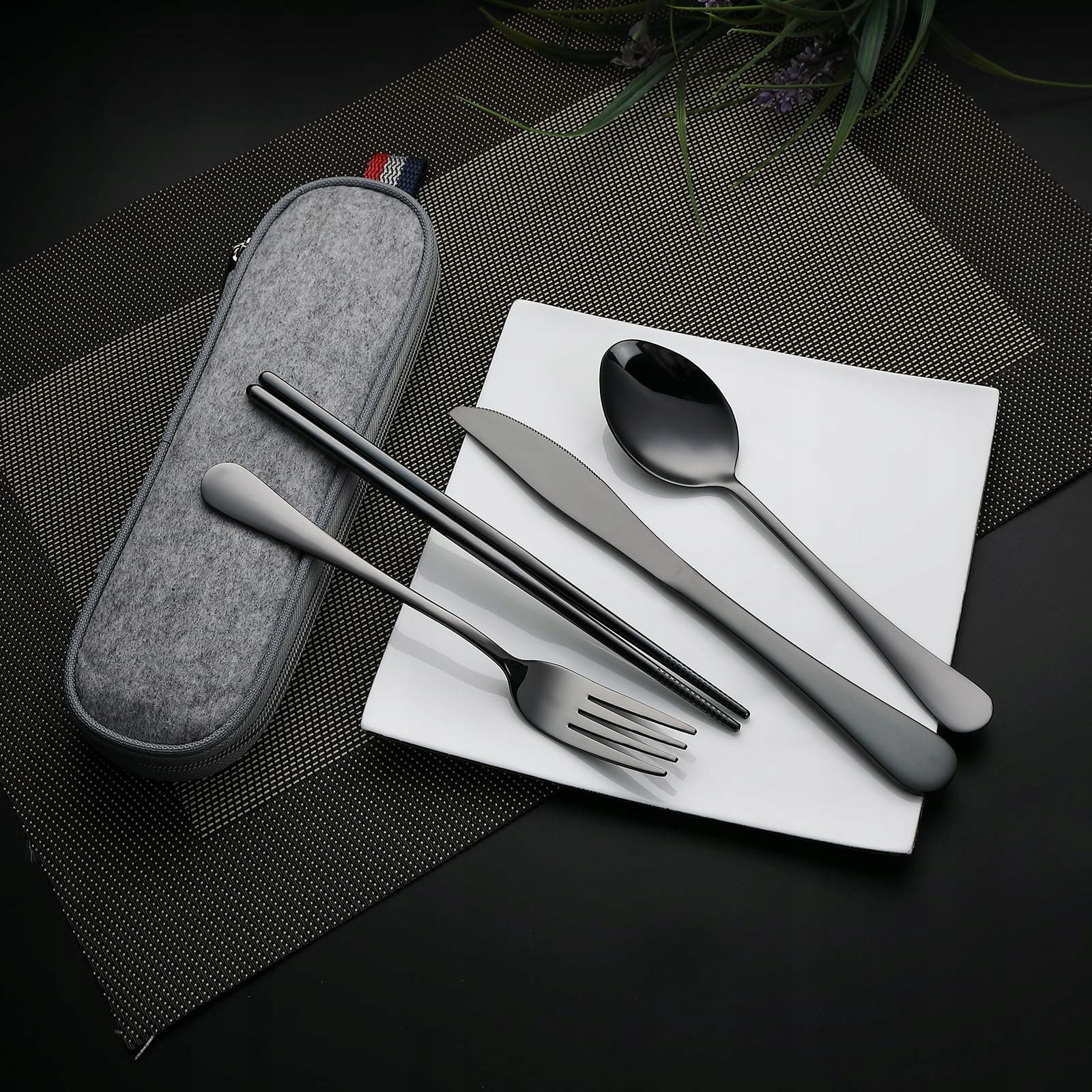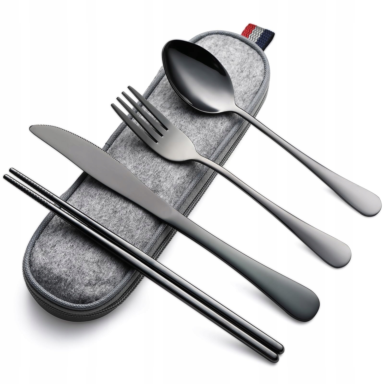 Ten minimalistyczny 5-częściowy zestaw sztućców podróżnych (dla dorosłych) zawiera widelec, łyżkę, nóż, pałeczki z precyzyjnym grawerem laserowym dla antypoślizgowego uchwytu (dolna część) oraz etui – przemyślany design dla trwałego użytkowania w podróży