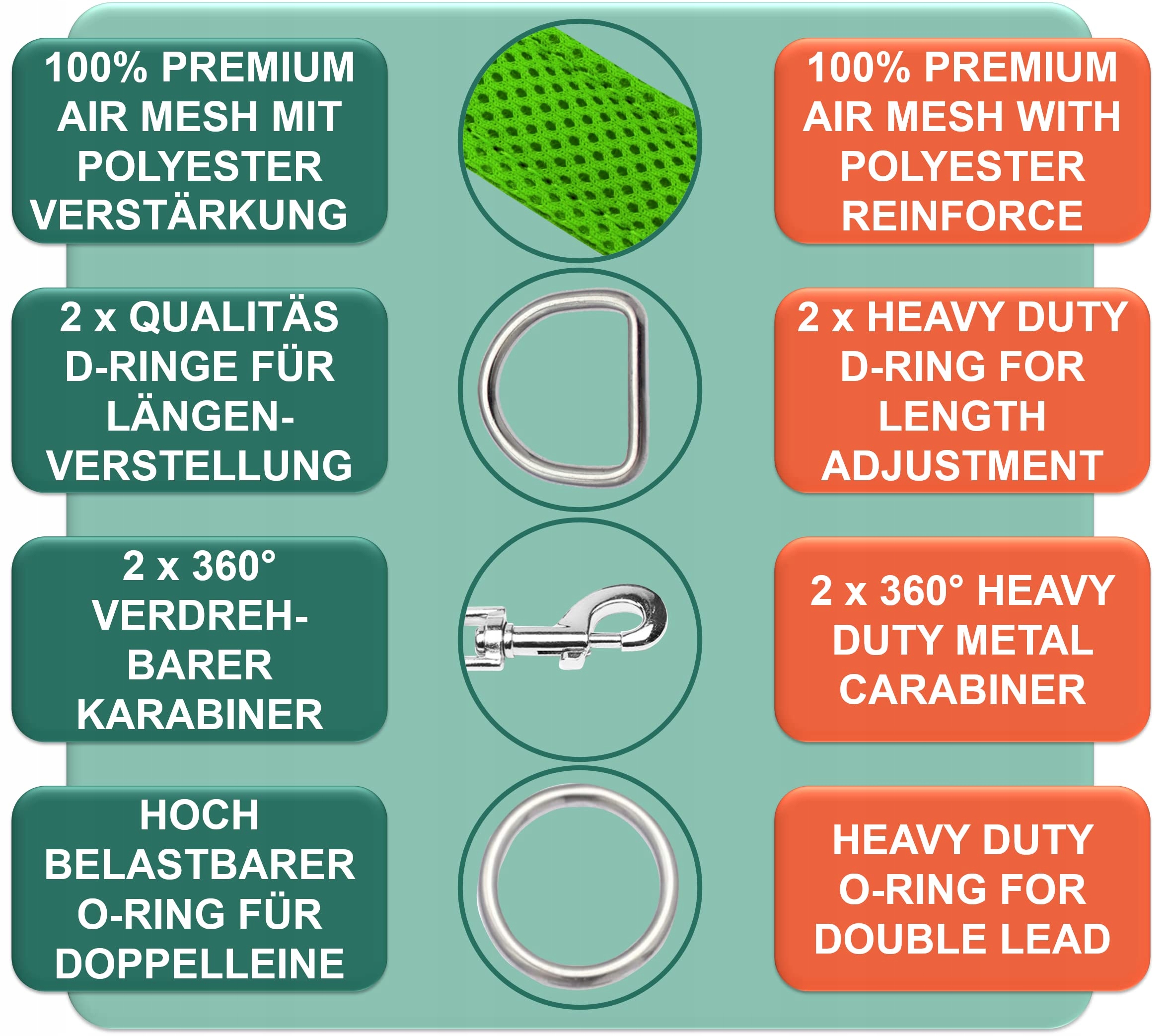 ✅ [Premium jakość] - Smycz dla psa wykonana jest w 100% z wysokiej jakości i wytrzymałego Premium Air Mesh. Materiał charakteryzuje się lekkością i oddychalnością. Dzięki przyjemnie miękkiemu Puffy Air-Mesh smycz idealnie leży w dłoni.