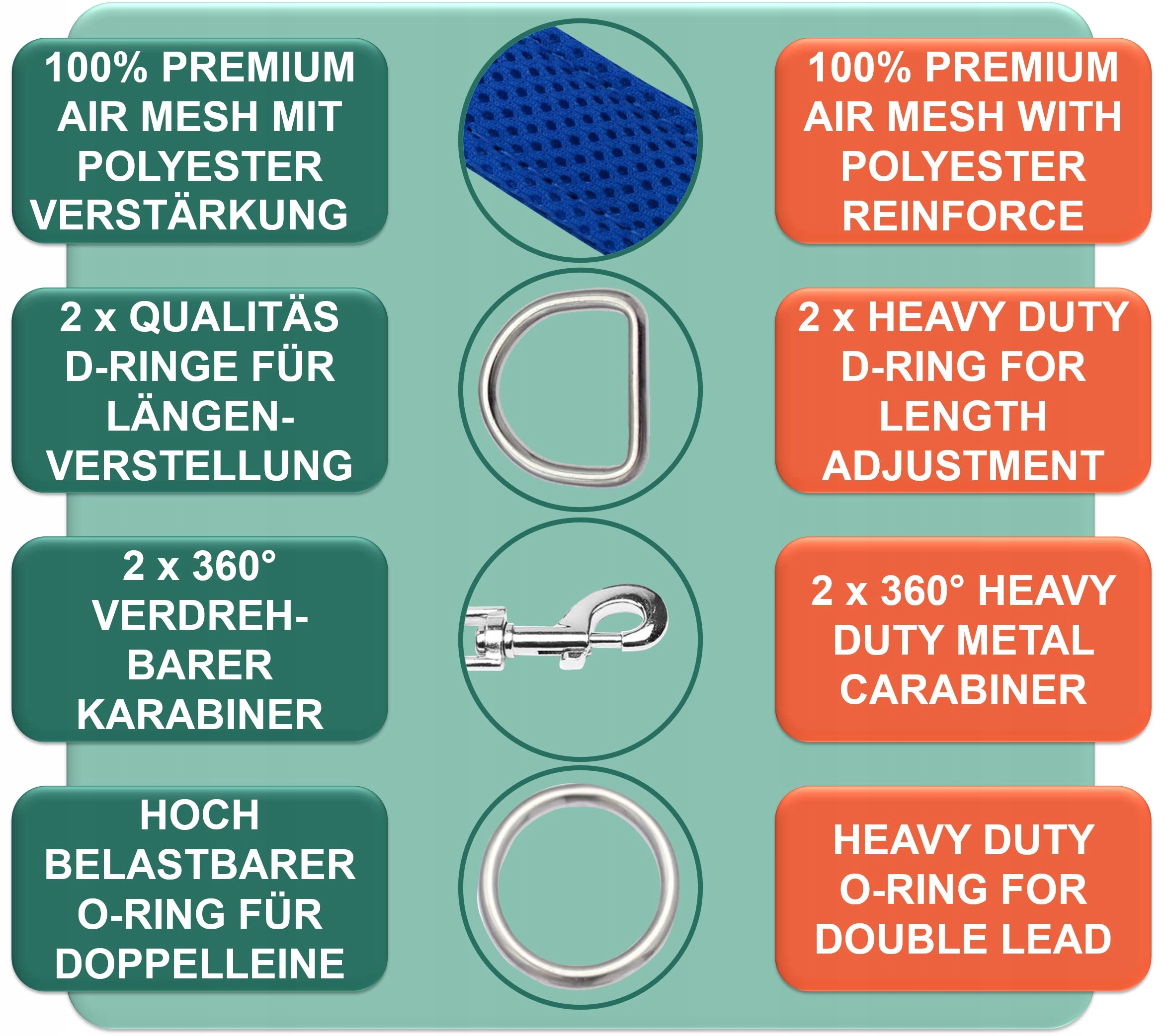 ✅ [Premium jakość] - Smycz dla psa wykonana jest w 100% z wysokiej jakości i wytrzymałego materiału Premium Air Mesh. Materiał charakteryzuje się lekkością i oddychalnością. Dzięki przyjemnie miękkiemu Puffy Air-Mesh smycz idealnie leży w dłoni.