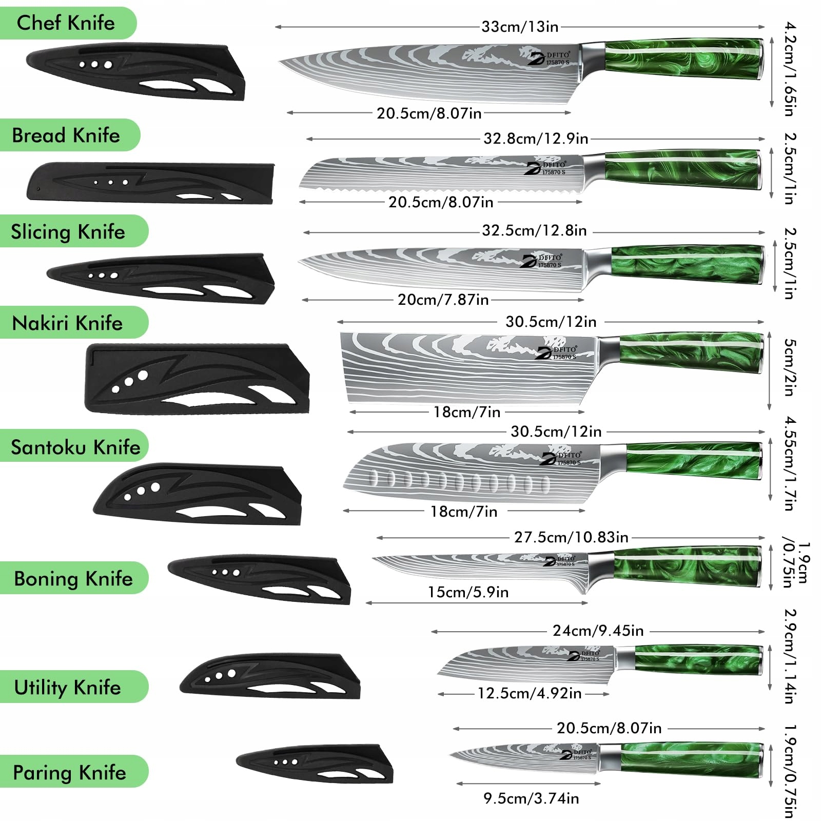 Zestaw noży z torbą na rolki: Ten zestaw noży Dfito jest dostarczany z pokrowcem na noże i torbą na rolki z nylonu, pokrowiec służy do ochrony ostrza noża i palców, a torba na rolki jest dobrym organizatorem do przechowywania noży kuchennych, co ułatwia i uprzyjemnia ich transport wszędzie tam, gdzie chcesz.