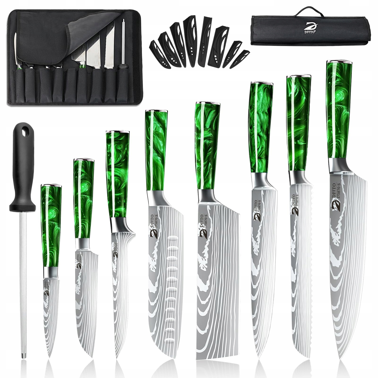 Zestaw noży Dfito z torbą na rolki z nylonu, 9-częściowy ostry profesjonalny zestaw noży kuchennych ze stali węglowej z pięknym uchwytem z żywicy, nóż szefa kuchni, nóż do chleba, nóż santoku, nóż do warzyw, ostrzałka