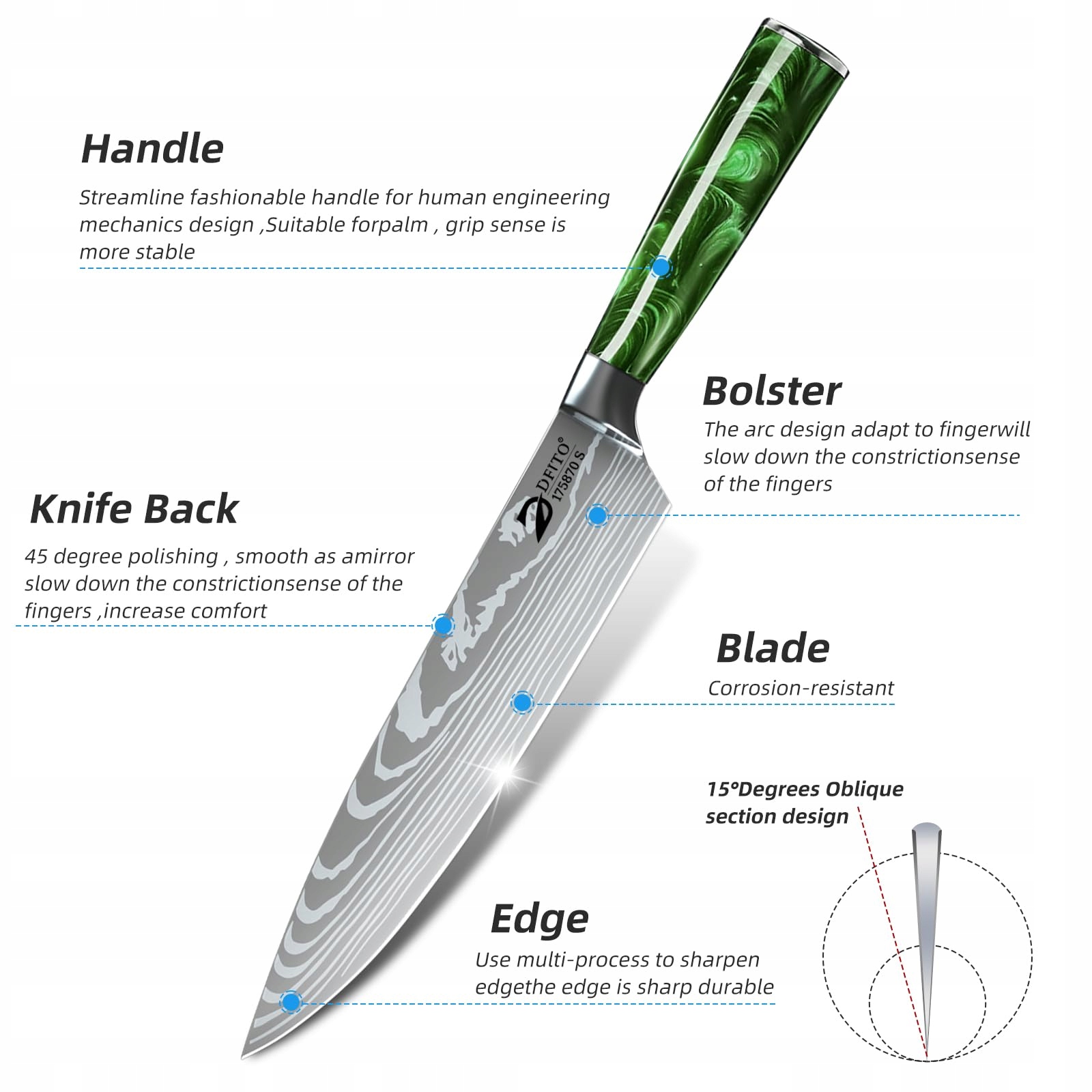 Trwałe i stabilne: Profesjonalny zestaw noży Dfito wykonany jest z węglowej stali nierdzewnej niemieckiej. (Wysokiej jakości specjalna stal 5cr15mov) Twardość Rockwella wynosi 56-58, co zapewnia wysoką jakość, ostrość i trwałość.