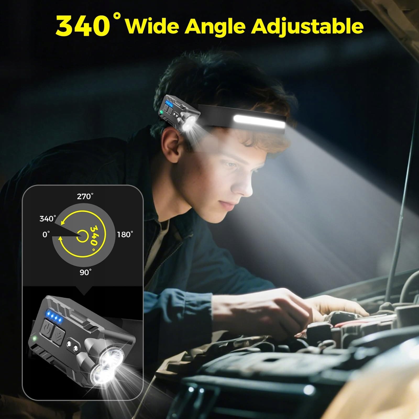 Wolne ręce: Latarka czołowa jest wyposażona w najnowsze inteligentne czujniki. Po włączeniu przełącznika czujnika możesz włączać i wyłączać latarkę przez potrząsanie rękami. Nawet w rękawiczkach możesz szybko włączać i wyłączać latarkę w trybie ruchu, pod warunkiem, że odległość od urządzenia nie przekracza 10 cm.
