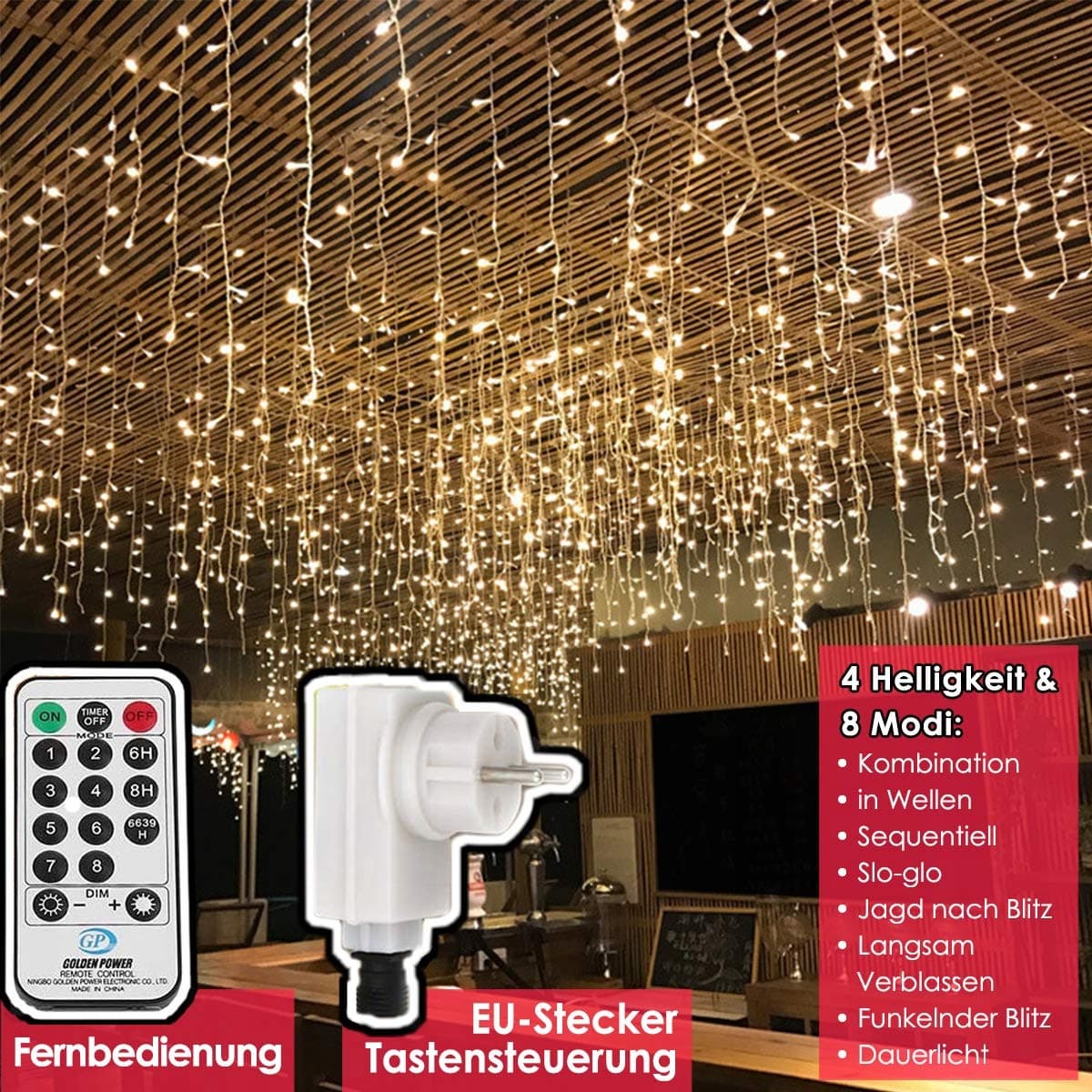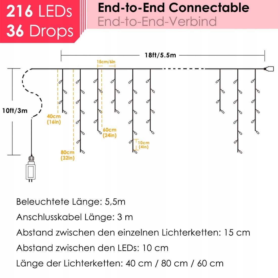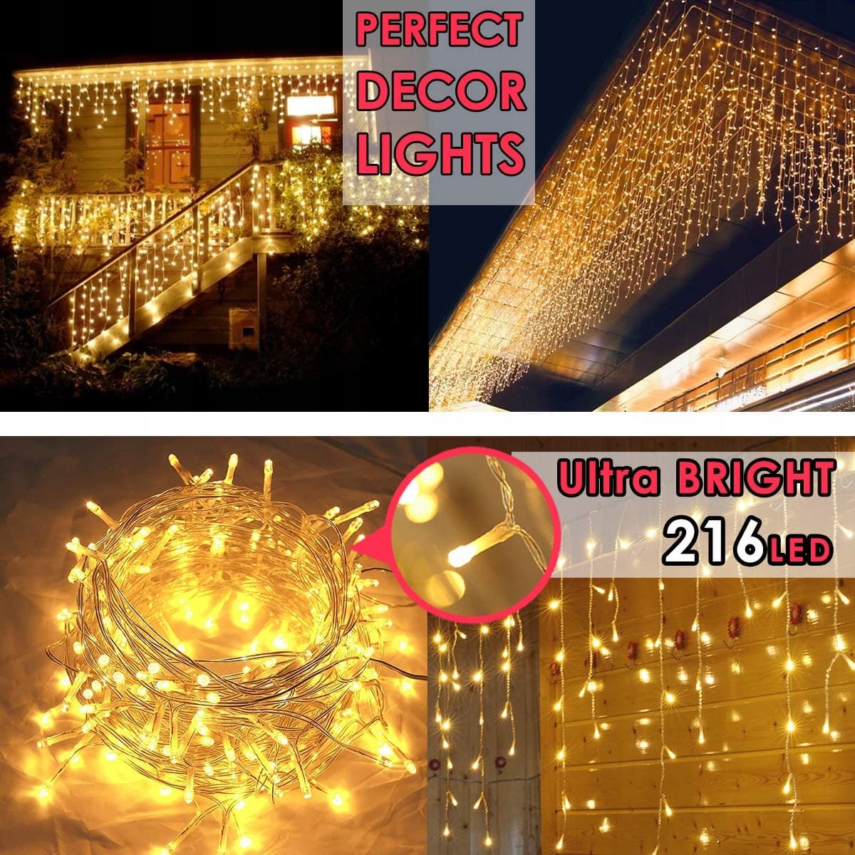 216 diodowa łańcuch świetlny, 5,5 m sopel lodu z wtyczką EU, 8 trybów świecenia, zasłona świetlna z soplami lodu z pilotem i timerem, dekoracja na zewnątrz i wewnątrz na Boże Narodzenie, ogród, imprezę, wesele, zimę (Ciepła biel)