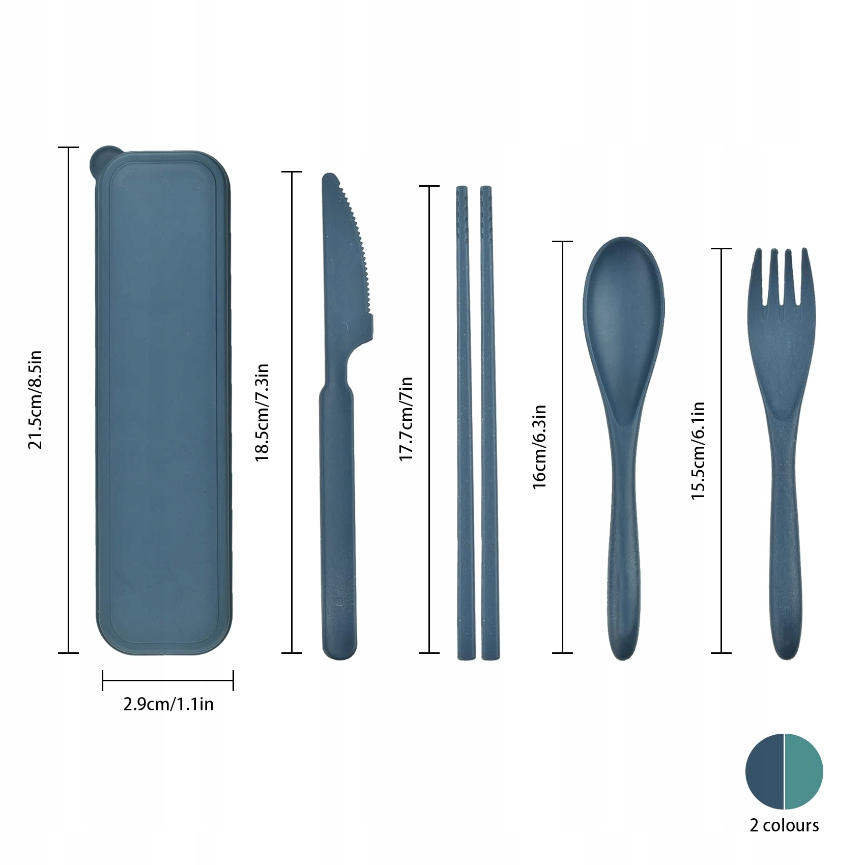 【Zestaw wartościowy】2-częściowy zestaw sztućców na wynos z etui nóż widelec łyżka pałeczki w kolorze niebieskim i zielonym. Zestaw sztućców kempingowych ma zakrzywiony kształt dla wygodniejszego uchwytu i nadaje się do codziennego użytku.