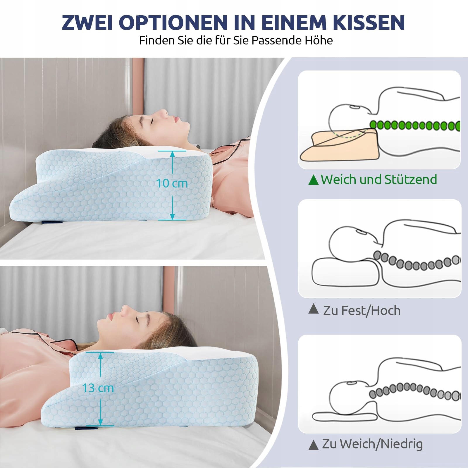 【Uniwersalny design dla wszystkich śpiących】Ta poduszka na szyję oferuje dwa różne poziomy wysokości do wyboru. Nasze poduszki w rozmiarze king-size zostały specjalnie zaprojektowane dla różnych pozycji snu i mogą być używane jako poduszka dla śpiących na plecach, brzuchu lub boku.