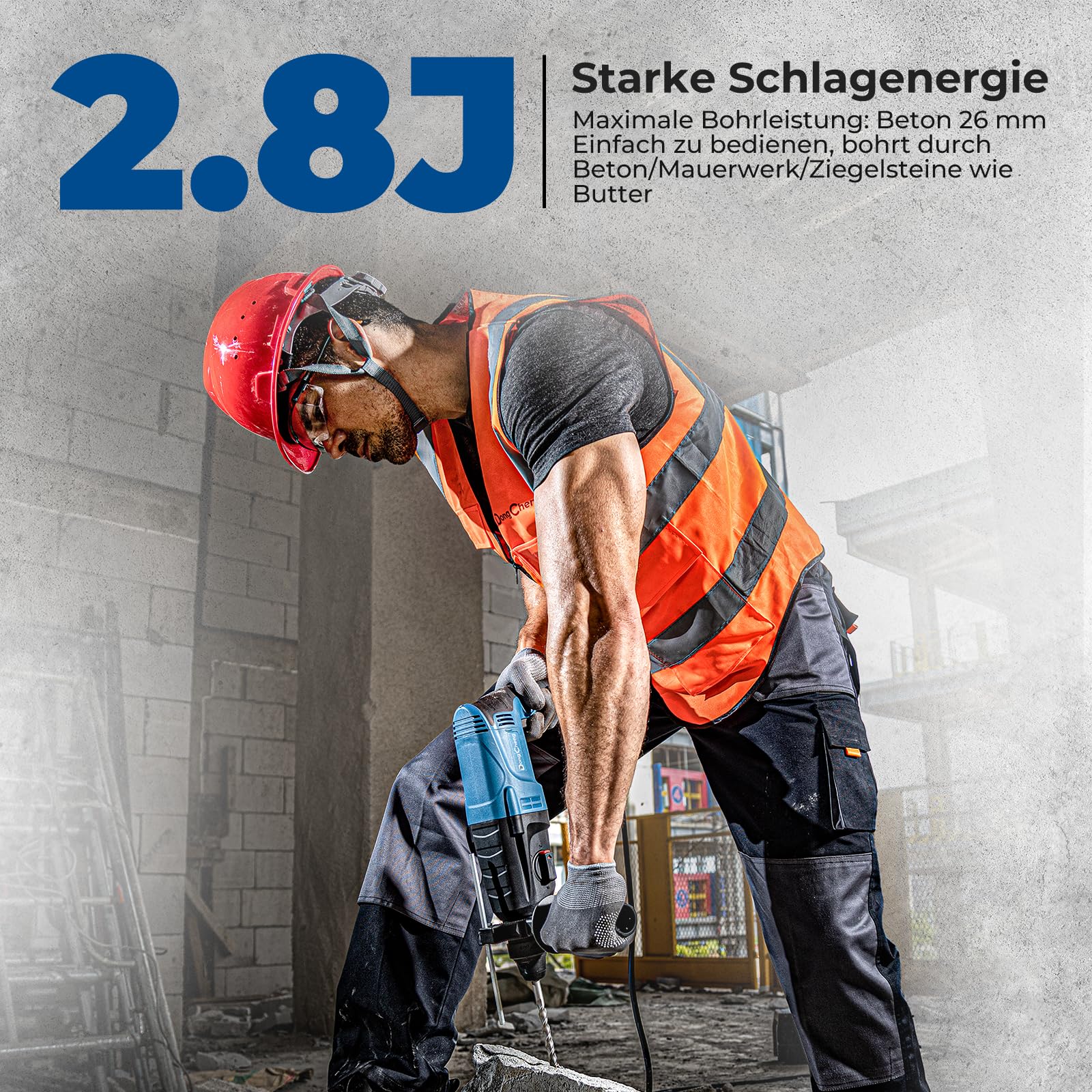 Doskonała wydajność: Młotowiertarka z mocą silnika 800 watów i energią udaru 2,8 J dla najwyższej wydajności wiercenia. Wydajność wiercenia: 26 mm, prędkość obrotowa: 0-1200 obr/min, nominalna częstotliwość udarów: 0-4000 BPM