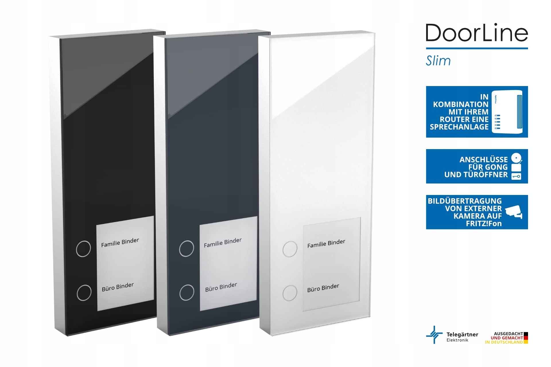 DoorLine Slim Kolor: antracyt od Telegärtner Elektronik | Sprytna stacja drzwiowa | zamienia system TK/ FRITZ!Box / router w interkom drzwiowy | rozszerzalna do wideodomofonu |