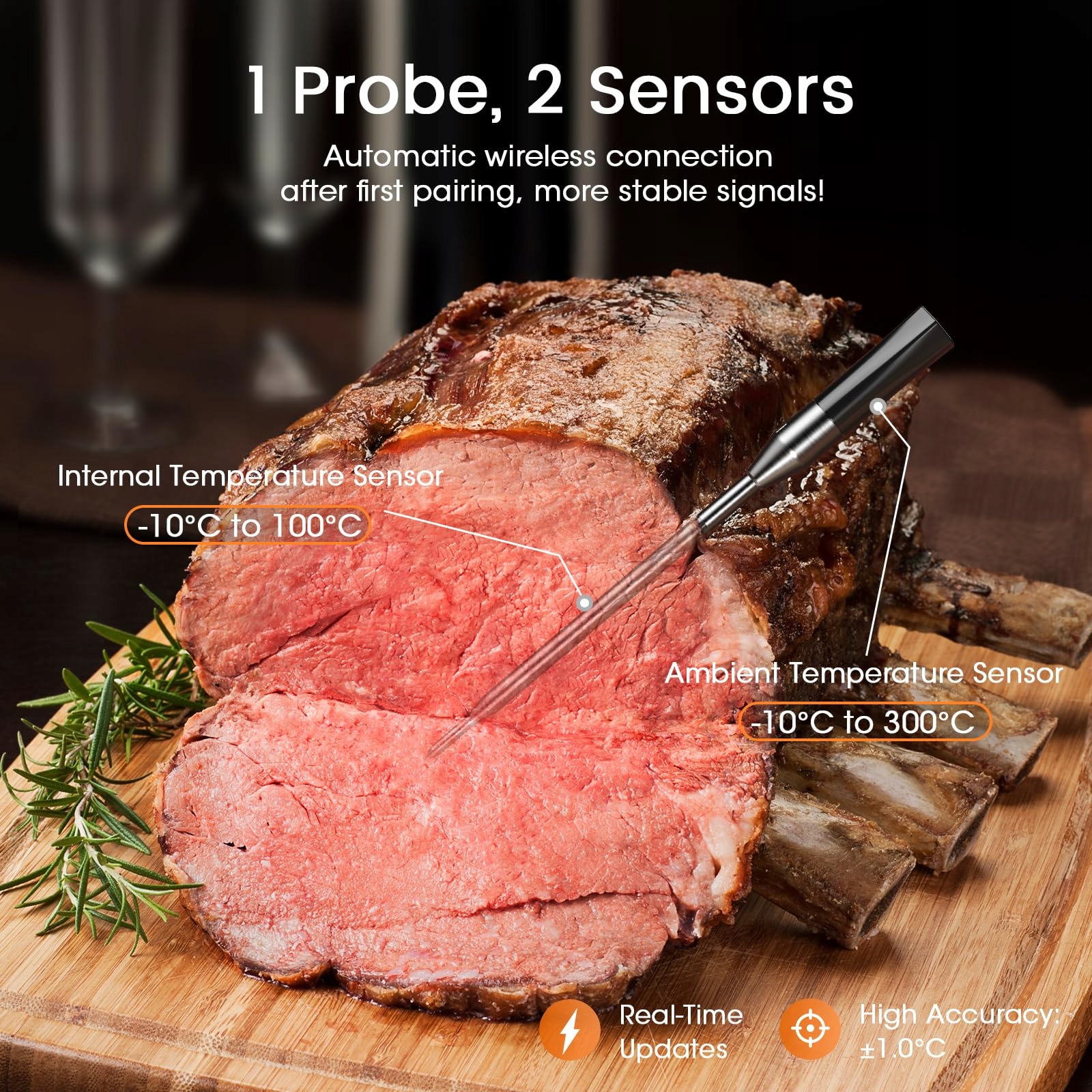 【Bardziej czuła sonda】Podwójne czujniki temperatury umożliwiają jednoczesne monitorowanie zarówno temperatury wewnętrznej (-10°C-100°C), jak i temperatury otoczenia/zewnętrznej (-10°C-300°C). Dzięki cienkiej sondzie i szybkiemu czasowi reakcji, bezprzewodowy termometr do mięsa DOQAUS przesyła aktualne temperatury żywności bezprzewodowo w mniej niż 1 sekundę, zapewniając dokładność ±1°C.