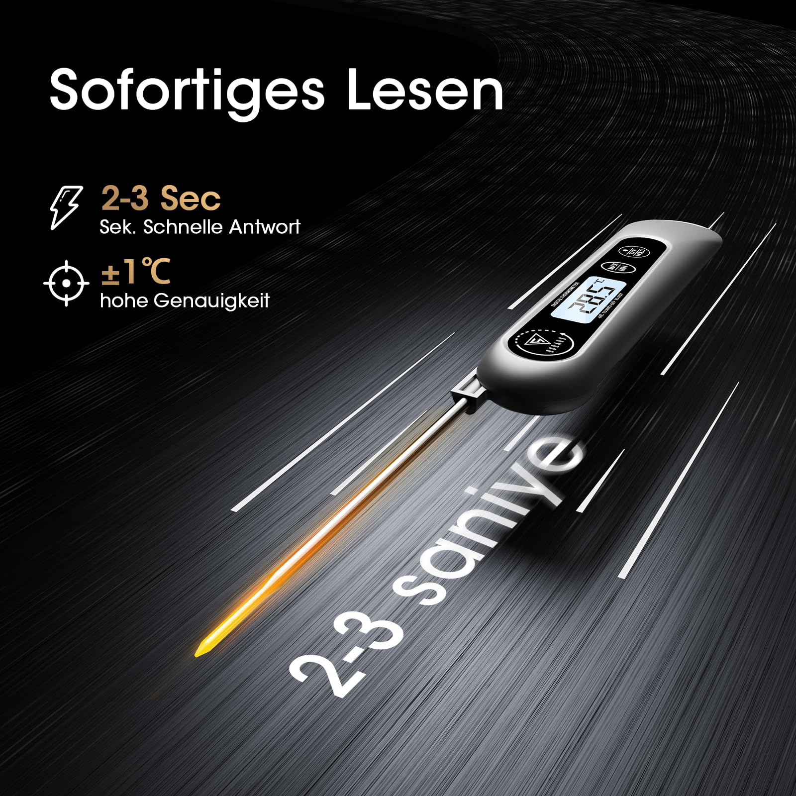 Szybko i dokładnie: Dzięki ultracienkiej sondzie temperatura może być wyświetlana dokładnie i szybko w ciągu 3 sekund. Czujnik kuchenny ma dokładność ± 1 °C (± 2 °F) i szeroki zakres od -50 °C do 300 °C (-58 °F do 572 °F). Termometry do żywności doskonale nadają się do określania optymalnej temperatury podczas grillowania lub gotowania, do sprawdzania bezpiecznej temperatury jedzenia dla niemowląt i wody do kąpieli i nie tylko
