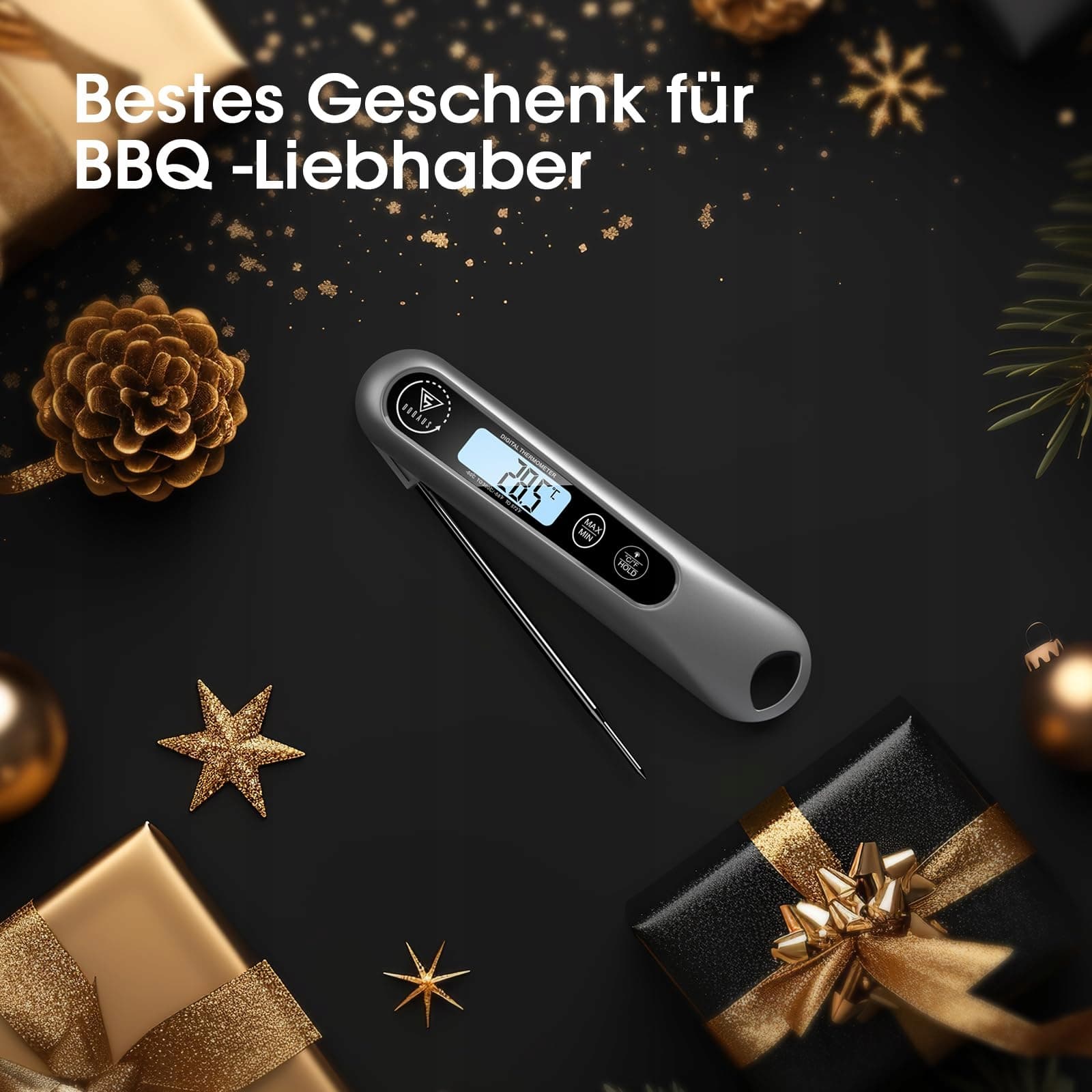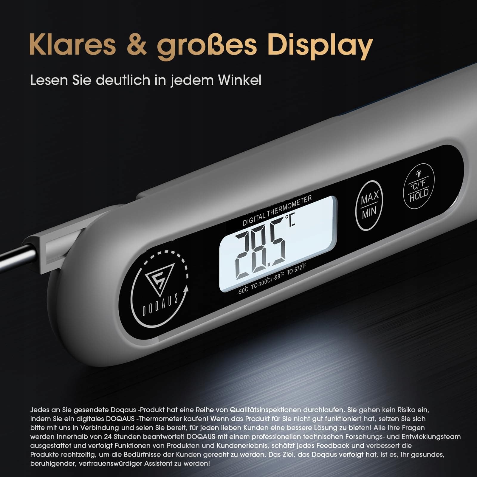 Duży wyświetlacz LCD: Duży, dobrze czytelny ekran z podświetleniem zapewnia doskonałą klarowność podczas odczytu temperatur w ciemności lub przy dymie! Dzięki przyciskowi „Hold” możesz „zatrzymać” wartość temperatury na wyświetlaczu, dzięki czemu możesz mierzyć i odczytywać temperaturę w dowolnym momencie, nawet poza źródłem ciepła