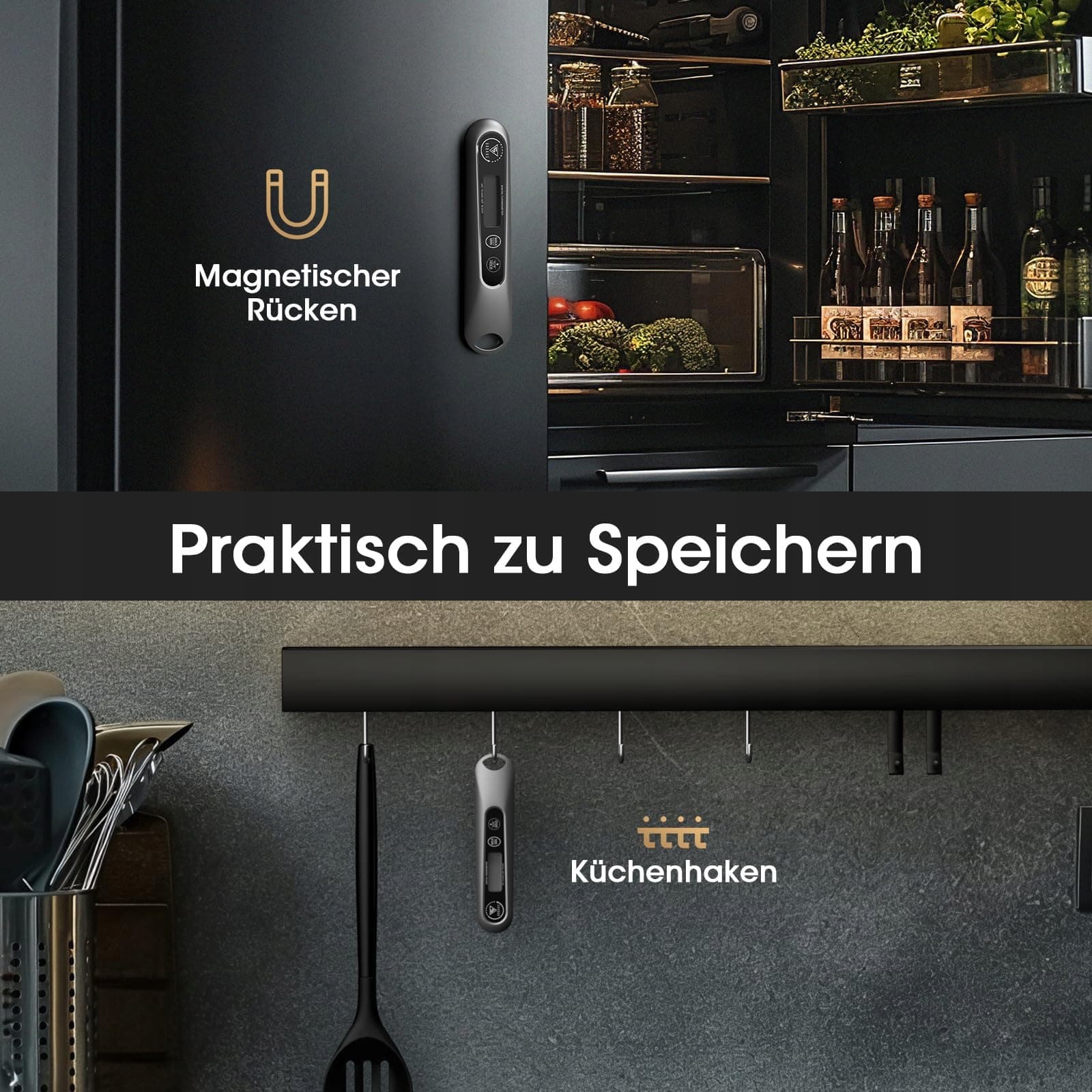 Praktyczne przechowywanie: Termometr do gotowania jest mały i łatwy do przechowywania, można go umieścić w torbie lub w szufladzie. Posiada wbudowane magnesy, które można mocno przymocować do metalu. Dodatkowo urządzenie ma otwór, dzięki czemu można je powiesić na ścianie. Dzięki instrukcji obsługi termometru do gotowania na opakowaniu możesz wybrać pożądany stopień wysmażenia