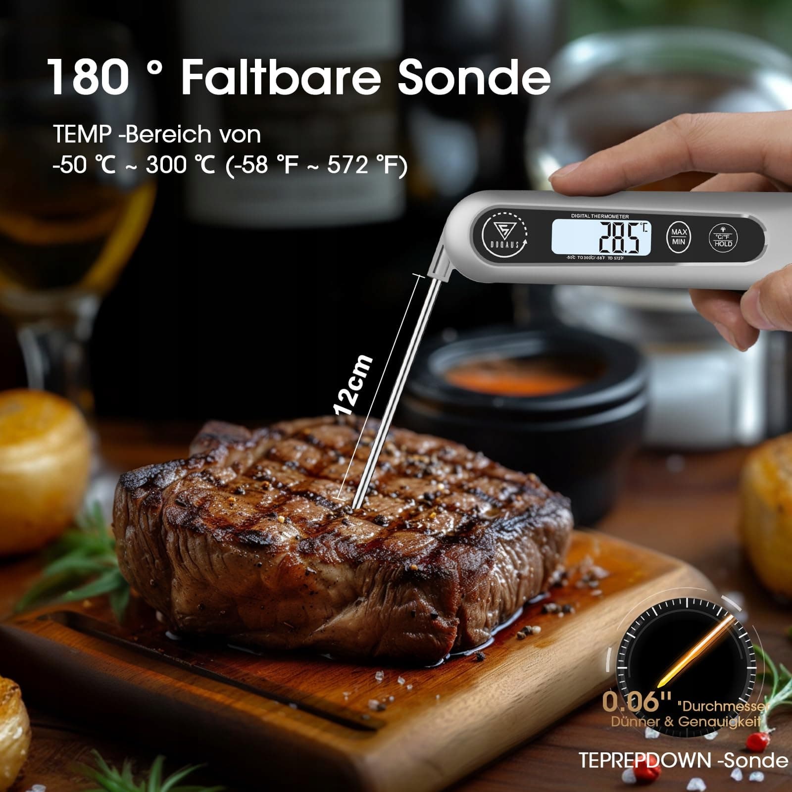 Dluga sonda: 12 cm długa sonda wykonana jest z wysokiej jakości stali nierdzewnej 304 i może łatwo sięgać do rdzenia dużych pieczeni, nie parząc przy tym palców. Sonda o średnicy 6 mm zapewnia wymaganą czułość dla dokładnych wyników pomiarów i minimalizuje zajmowaną przestrzeń dla żywności. Sonda obracająca się o 180°, dzięki której możesz mierzyć temperaturę żywności pod każdym kątem