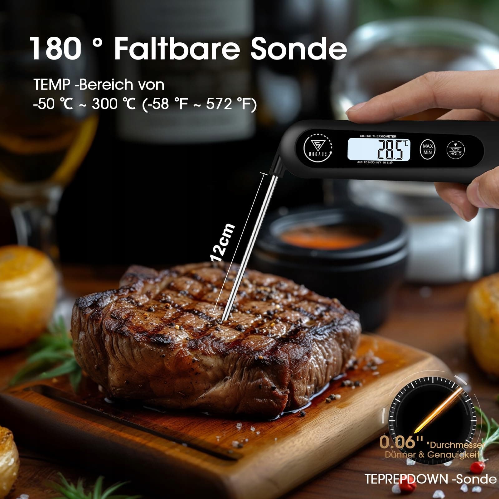 Szybki i dokładny: Dzięki ultracienkiej sondzie temperatura może być dokładnie i szybko wyświetlana w ciągu 3 sekund. Czujnik gotowania ma dokładność ± 1 °C (± 2 °F) i szeroki zakres od -50 °C do 300 °C (-58 °F do 572 °F). Termometry do żywności doskonale nadają się do określania optymalnej temperatury podczas grillowania lub gotowania, do sprawdzania bezpiecznej temperatury jedzenia dla niemowląt i wody do kąpieli i nie tylko