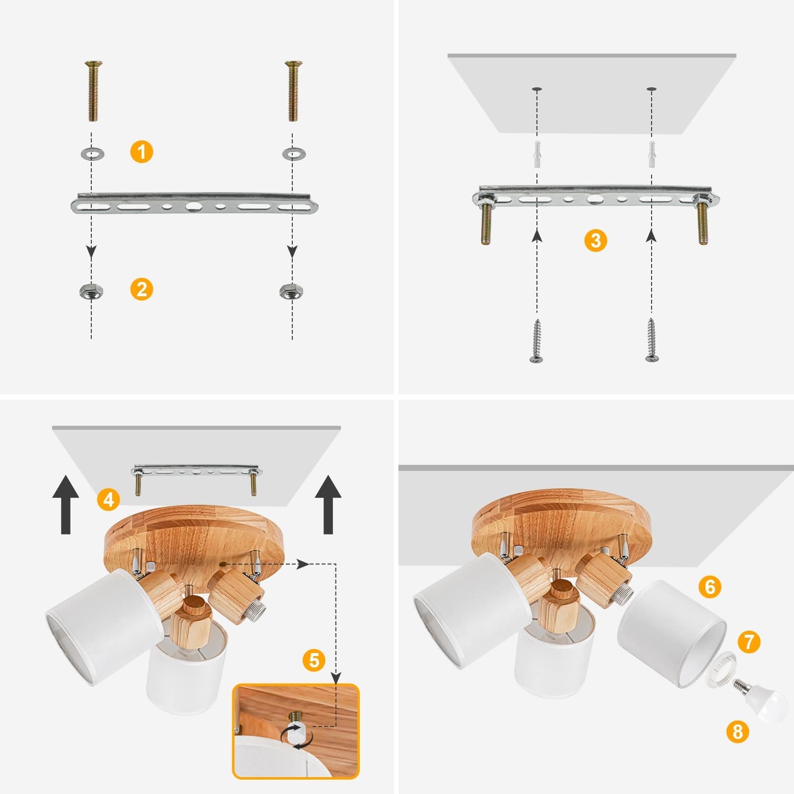 【Pierwszy projekt krawędzi drewnianej na całej platformie, który redukuje wrażenie metalu】: W porównaniu do innych lamp sufitowych, używamy projektu z drewnianą krawędzią i białą nakrętką, aby zastąpić odsłonięte śruby, ukryć ślady instalacji i stworzyć zintegrowaną krawędź oraz podstawę z drewnianym usłojeniem. Dzięki temu powstaje elegancki vintage reflektor sufitowy. Wysokoprzezroczysty klosz lampy z białego materiału zapewnia w połączeniu odprowadzanie ciepła.