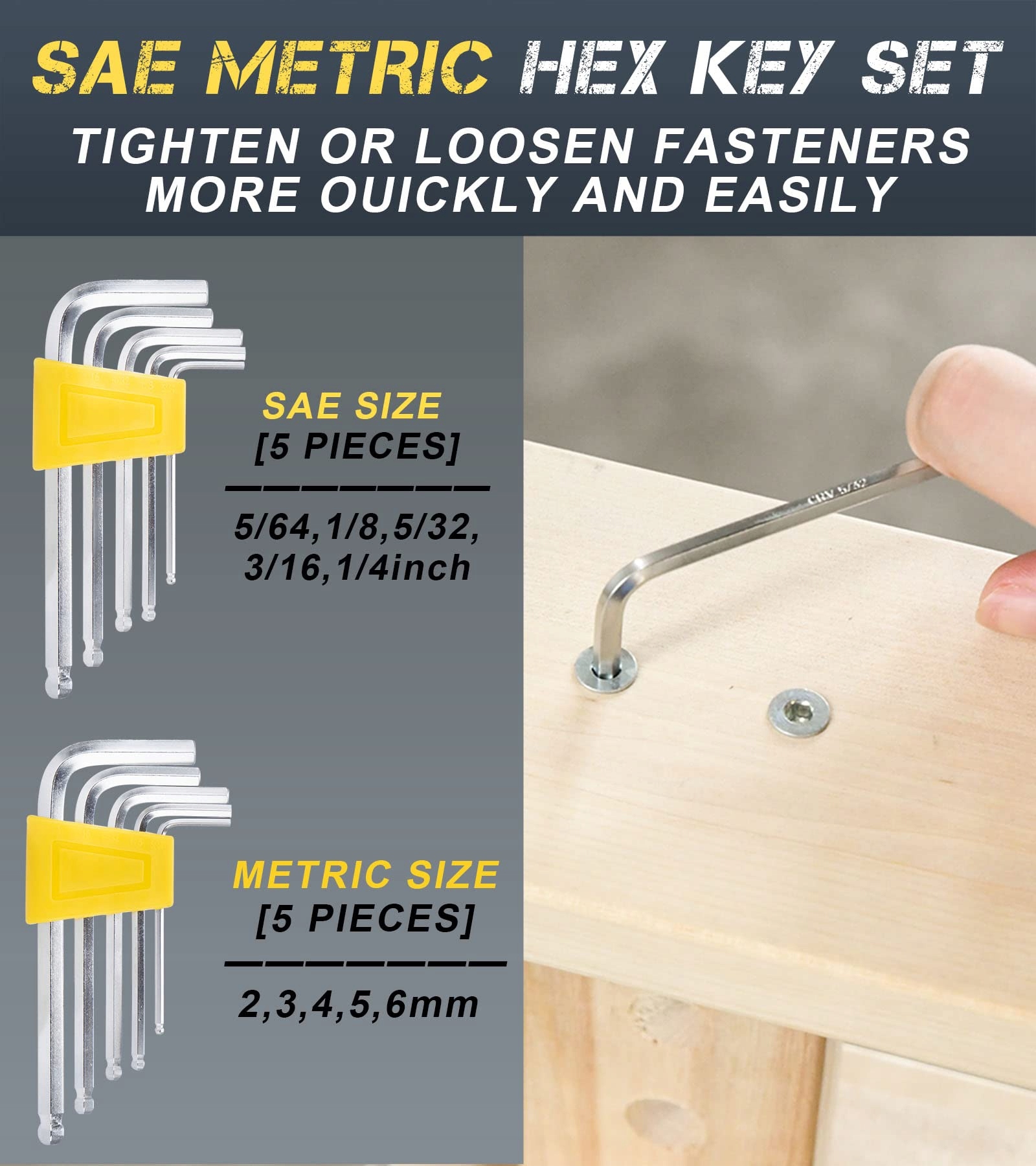 108-elementowy zestaw wkrętaków: zawiera wkrętaki płaskie, krzyżowe i Torx, wkrętaki Stubby i precyzyjne, 40-elementowy zestaw bitów, zestaw kluczy sześciokątnych SAE i metrycznych, narzędzie do magnetyzacji i demagnetyzacji oraz torbę z różnymi śrubami.