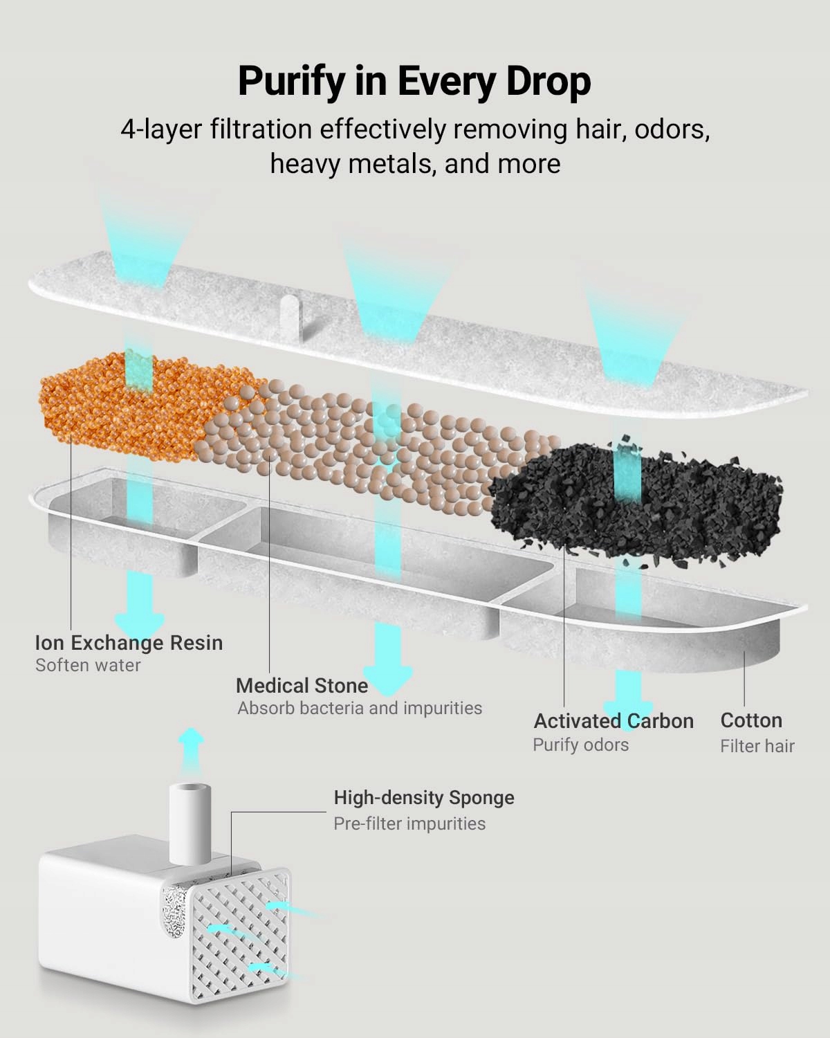 Wszystko dla zdrowia Twojego zwierzaka - Każda kropla wody jest filtrowana przez wielostopniowy system filtracji, aby usunąć wszystkie zanieczyszczenia i dostarczyć wodę wzbogaconą w tlen i lepiej smakującą.