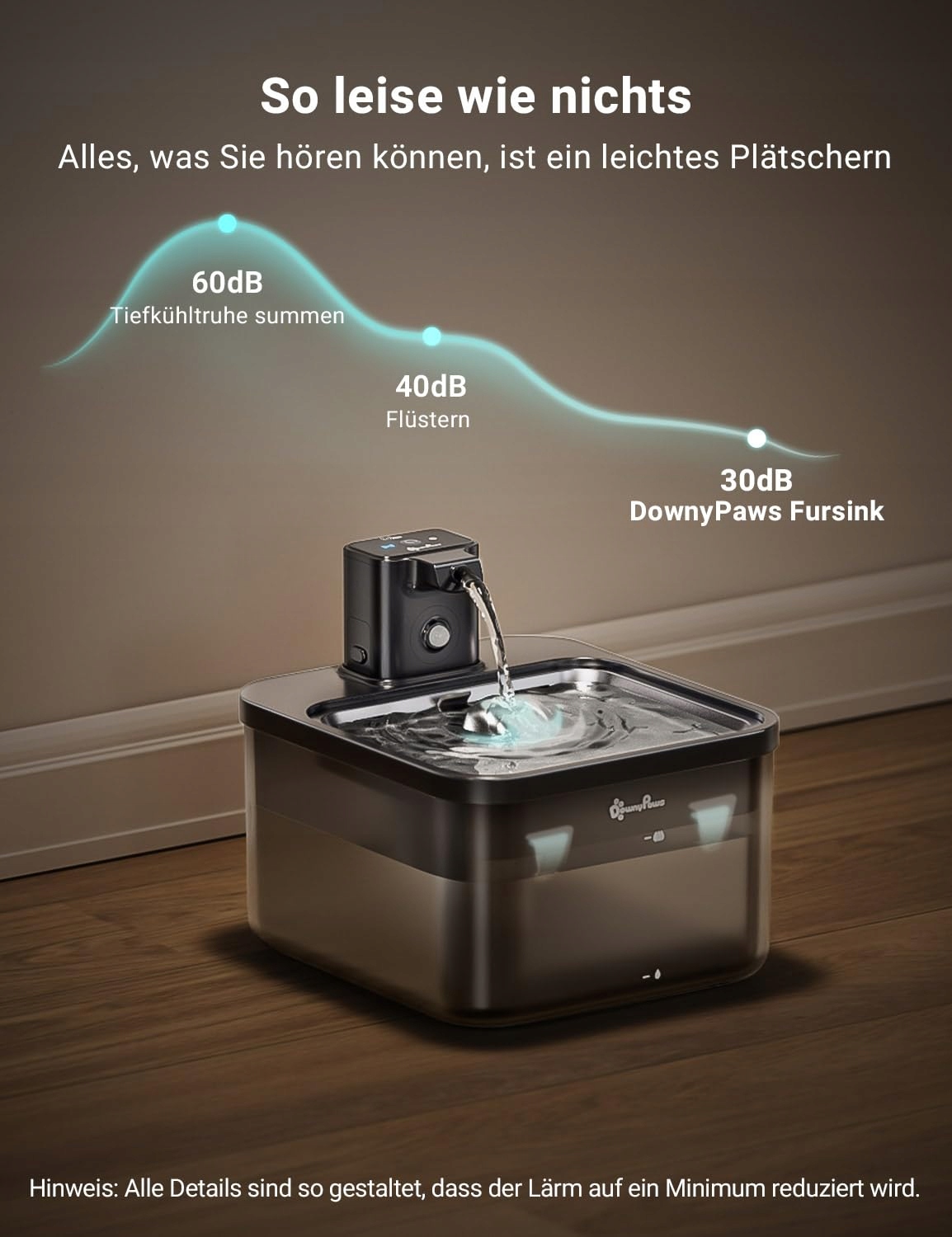 Cicha i inteligentna pompa fontanny dla kotów - Bezprzewodowa fontanna DownyPaws dla kotów posiada cichą pompę o głośności 30 decybeli, która zapewnia spokojne otoczenie. Wyposażona w ochronę poziomu wody, pompa automatycznie wyłącza się, gdy poziom wody jest niski. Chroni fontannę przed uszkodzeniem i wydłuża jej żywotność, zapewniając niezawodne i długotrwałe użytkowanie.