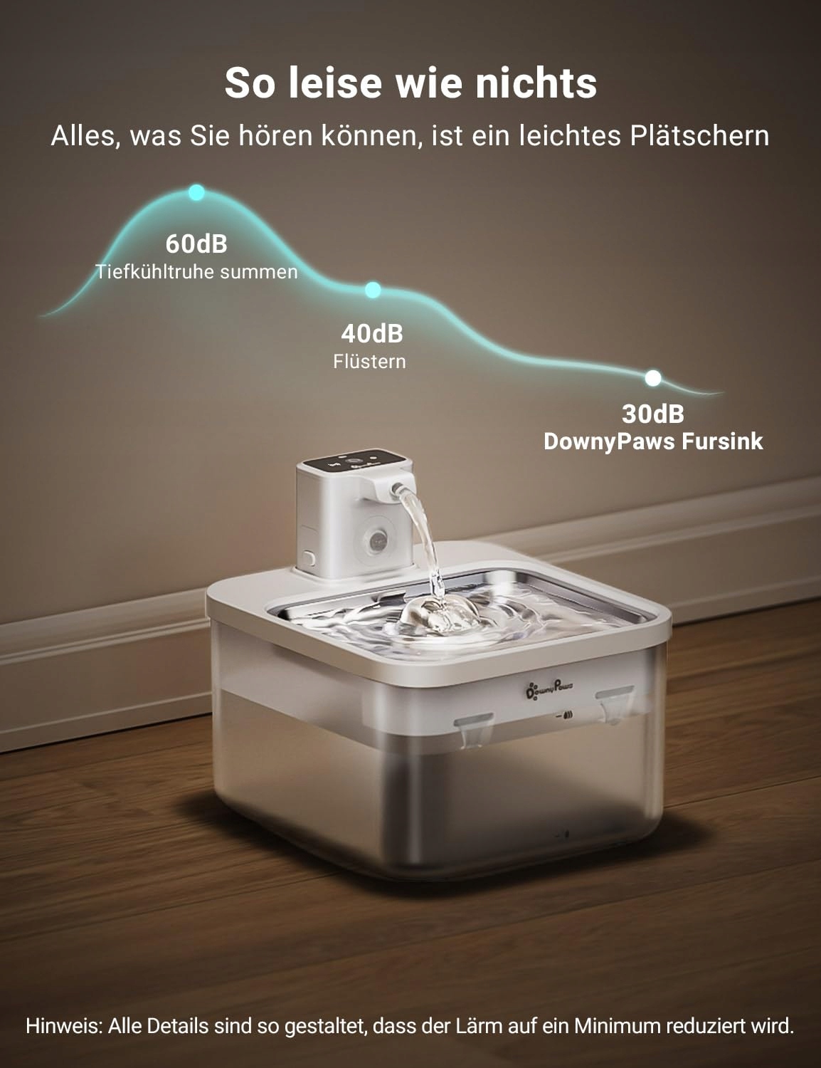 Cicha i inteligentna pompa fontanny dla kotów - Bezprzewodowa fontanna DownyPaws dla kotów posiada cichą pompę fontanny dla kotów o głośności 30 decybeli, która zapewnia spokojne otoczenie. Wyposażona w ochronę poziomu wody, pompa automatycznie wyłącza się, gdy poziom wody jest niski. Chroni fontannę przed uszkodzeniami i wydłuża jej żywotność, zapewniając niezawodne i długotrwałe użytkowanie.