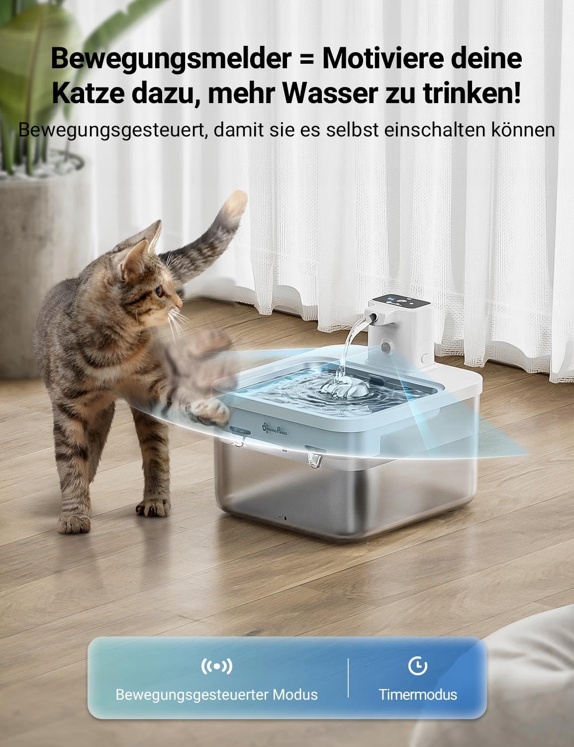 Dwa tryby wody - Fontanna DownyPaws dla kotów z czujnikiem ruchu symuluje przepływ wody jak z kranu. Tryb timera i czujnika ruchu. Woda płynie, gdy kot się zbliża (<1,5 m, 120º), jak odkręcony kran, pobudzając zainteresowanie piciem. Tryb timera: co 15 minut 20 sekund wody. 2 opcjonalne tryby wody dla potrzeb kotów.