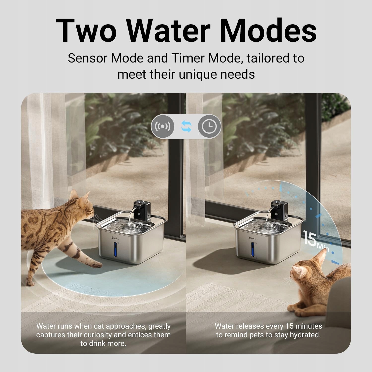 Dwa tryby wody - Unikalny design fontanny DownyPaws symuluje preferowany przez koty przepływ wody w stylu kranu i oferuje dwa tryby pracy. Tryb czujnika ruchu automatycznie wydaje wodę, gdy Twój kot się zbliża, podczas gdy tryb czasowy wydaje wodę co 15 minut na 20 sekund. Oba tryby mają na celu zachęcenie Twojego kota do picia większej ilości wody.