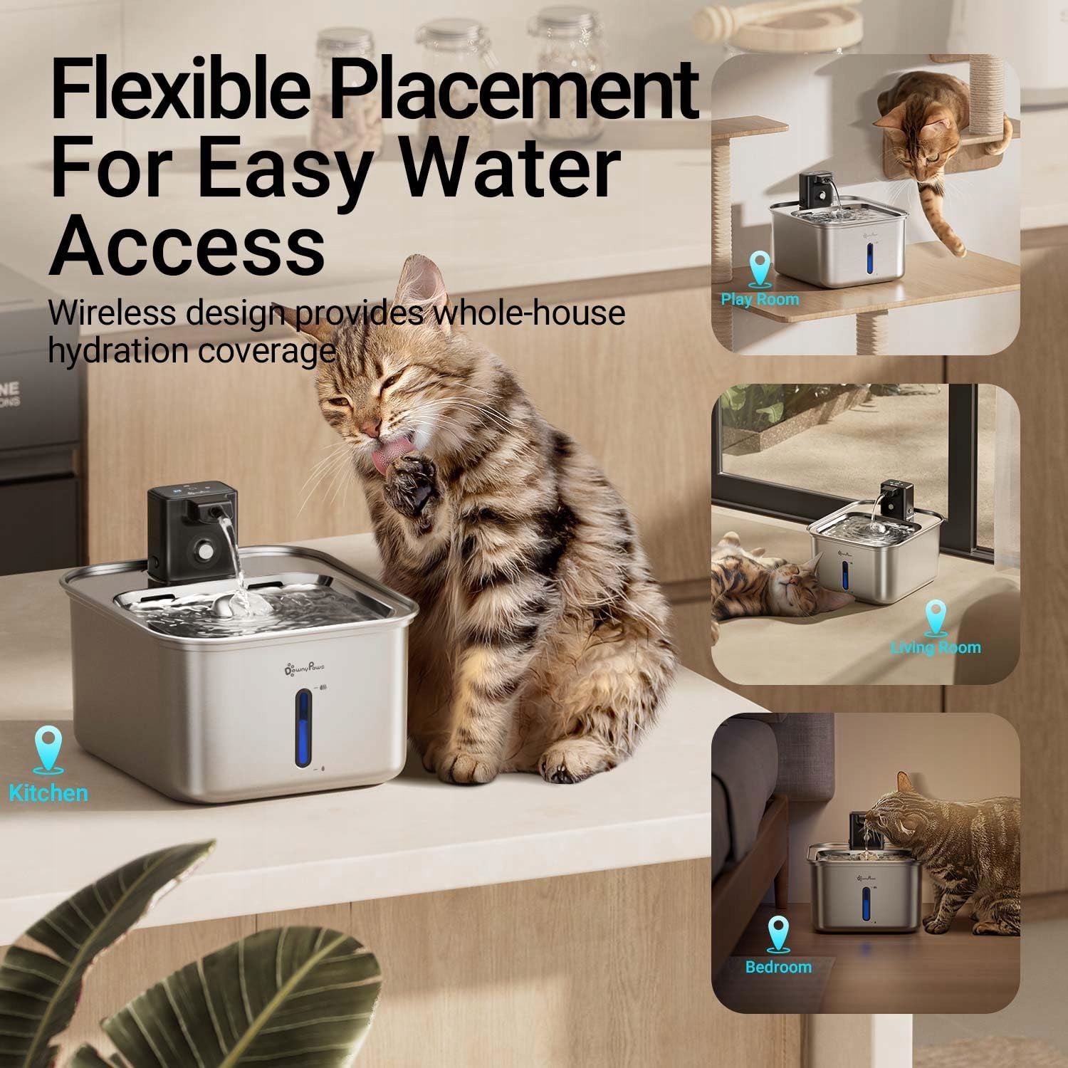 Ciesz się najwyższym komfortem – bezprzewodowa fontanna dla kotów, która zapewnia Twoim kotom świeżą wodę w każdej chwili i w każdym miejscu. Niezależnie od tego, czy jest to salon, sypialnia, kuchnia, łazienka, czy nawet na zewnątrz, możesz bez problemu ustawić tę bezprzewodową fontannę, aby zaspokoić potrzeby wodne Twojego kota.