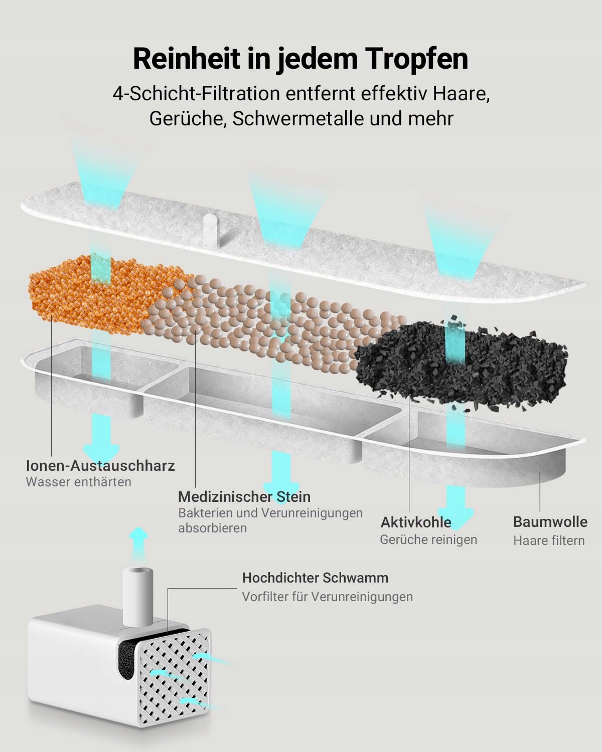 Wszystko dla zdrowia Twojego zwierzaka - Każda kropla wody jest filtrowana przez wielostopniowy system filtracji, aby usunąć wszystkie zanieczyszczenia i dostarczyć wodę wzbogaconą w tlen i lepiej smakującą.