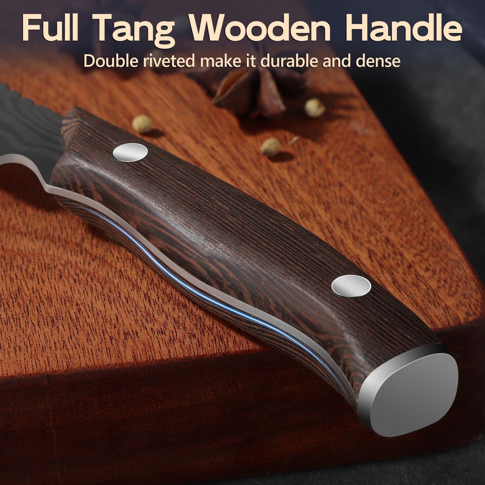 Uchwyt z pełnym trzpieniem: Zestaw noży stekowych Dragon Creek charakteryzuje się konstrukcją z pełnym trzpieniem i podwójnie nitowanym designem, co zapewnia niezawodną wytrzymałość i przyjemną wagę. Ergonomicznie uformowane drewniane uchwyty zapewniają zrównoważony i komfortowy chwyt, co ułatwia krojenie steków i filetów oraz inne zadania w kuchni.