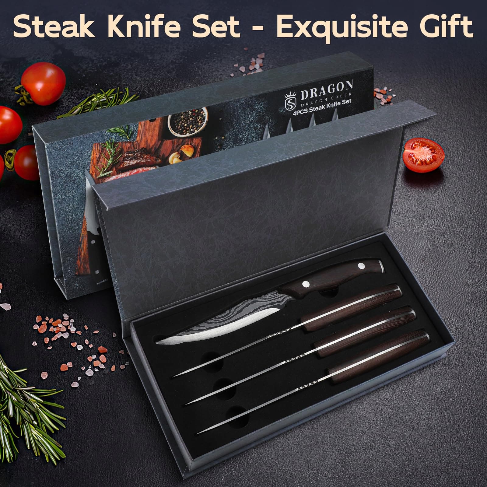 Zestaw noży stekowych Dragon Creek z drewnianym uchwytem, 4-częściowy nóż ze stali nierdzewnej, sztućce do steków na prezent dla domu i restauracji, ostre noże do mięsa, prezenty dla mężczyzn, kobiet, ojców, matek