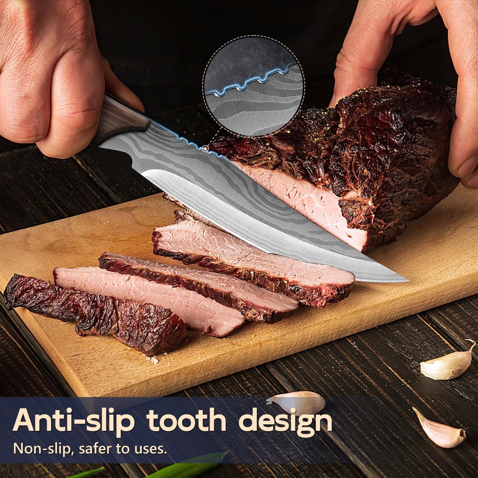 Ostrza bez ząbkowania: Noże stekowe Dragon Creek bez ząbkowania mają ostre, proste ostrza, które czysto i precyzyjnie kroją steki i inne rodzaje mięsa, nie rwiąc ani nie szarpiąc. Minimalizuje to utratę naturalnych soków i pomaga zachować smak, delikatność i ogólną jakość steku.