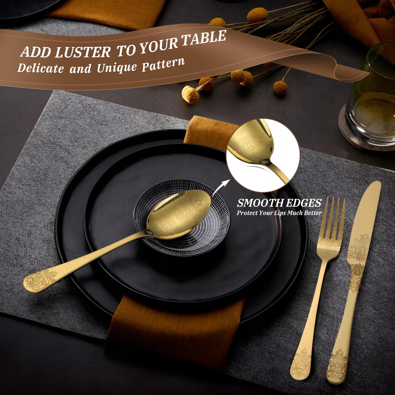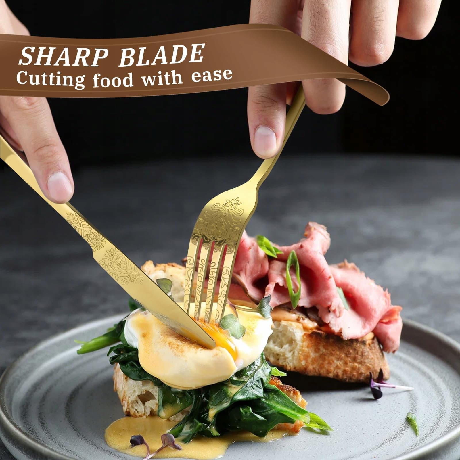 Eleganckie złoto, które wzbogaca kulturę stołu — Szlachetny złoty design z delikatnymi wzorami nadaje Twojemu stołowi nutę luksusowego blasku. Niezależnie od codziennego użytku czy uroczystych okazji – te sztućce podkreślają Twój styl i gust.