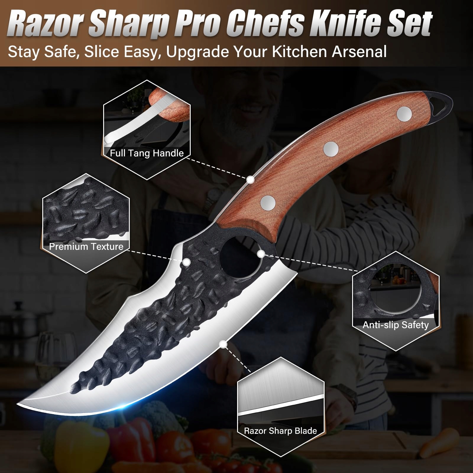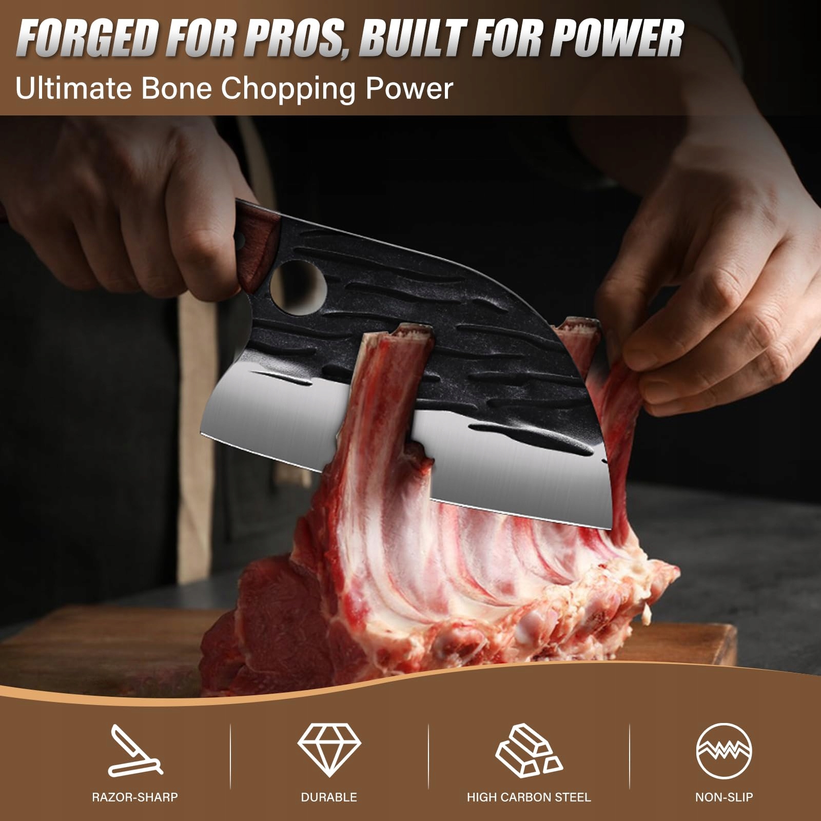 【Wysokiej jakości zestaw noży kutych】Nasz zestaw noży rzeźniczych składa się z wysokiej jakości stali węglowej. Wykonany przez doświadczonych rzemieślników z wykorzystaniem nowoczesnej technologii CNC, każdy krok wysokotemperaturowego kucia jest precyzyjnie kontrolowany. Efekt: każdy nóż osiąga twardość Rockwella 59 HRC. Ten profesjonalny zestaw noży rzeźniczych będzie Twoim niezawodnym towarzyszem.