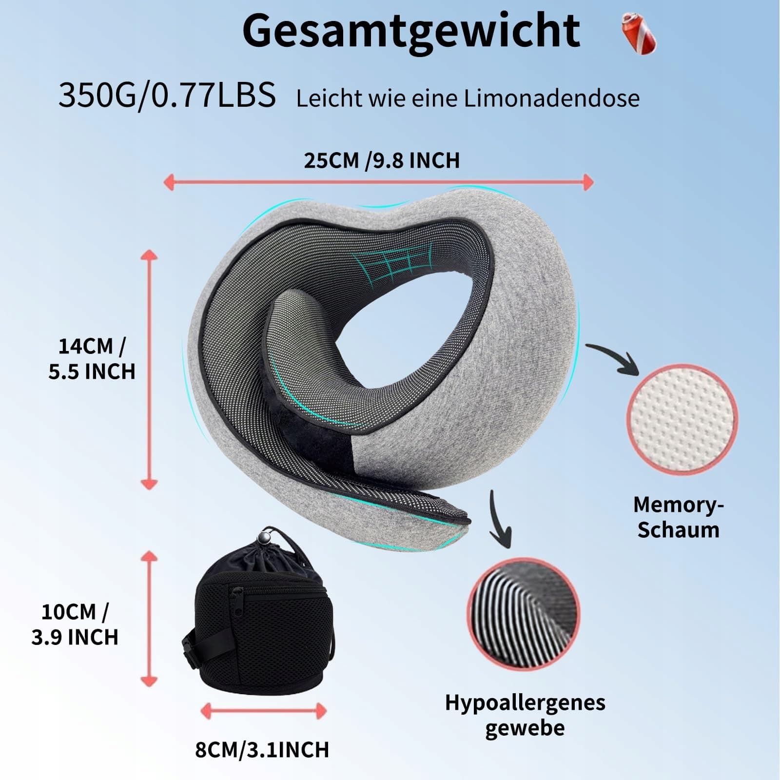 【Oddychająca pianka memory】: Wnętrze poduszki podróżnej do samolotu wykonane jest z wysokoelastycznej pianki memory z otworami, które rozwiązują problem słabej elastyczności i oddychalności tradycyjnej pianki memory. Pianka memory wykonana jest z materiału nieutleniającego się, który chroni przed kurzem i utlenianiem.