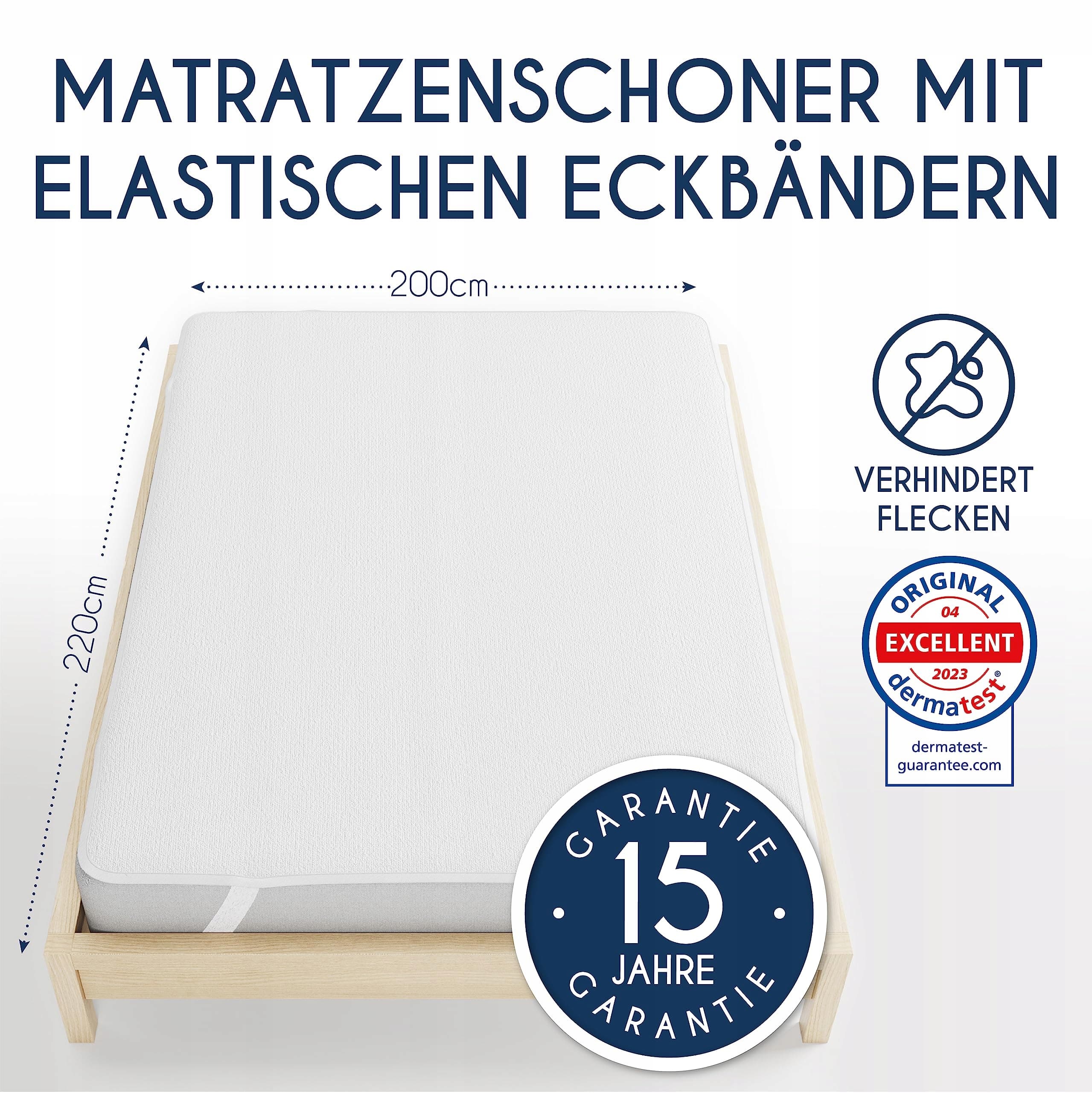 OCHRANIACZ NA MATERAC 100% WODOODPORNY I ODDYCHAJĄCY - Pokrowiec na materac jest wodoodporny i skutecznie odpycha wilgoć, kurz, plamy, pot, mocz i inne płyny: wydłuż żywotność swojego materaca i oszczędzaj na dłuższą metę! 200 x 220 cm odnosi się do rozmiaru materaca, wymiary ochraniacza mogą się różnić o kilka centymetrów, aby lepiej dopasować się do poduszki