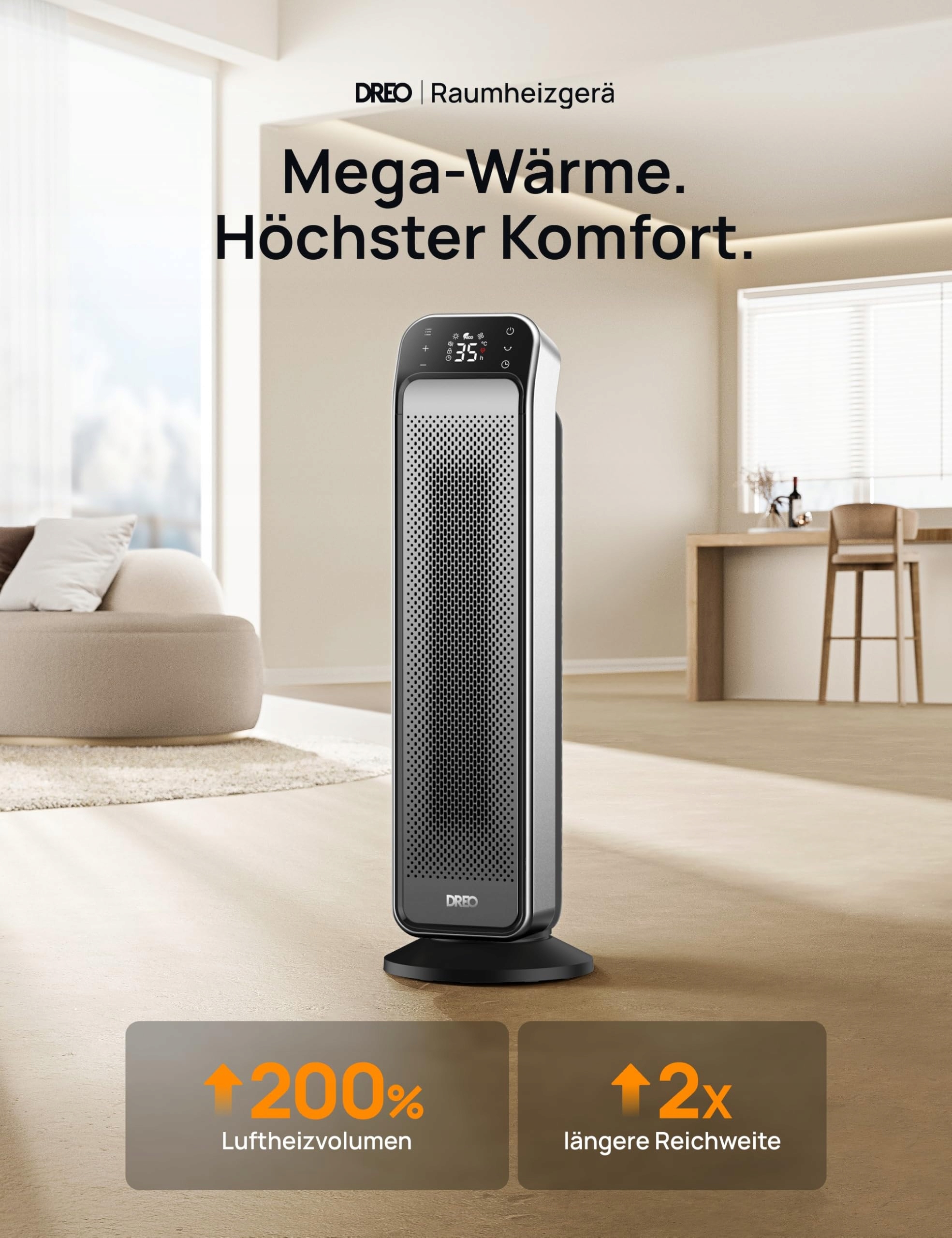Ostateczne doświadczenie grzewcze: Ulepszony 25-calowy ceramiczny grzejnik pokojowy Dreo dostarcza szybkiego ciepła z prędkością 11,5 stopy/sekundę dzięki nowemu hiperamicznemu projektowi cieplnemu, podczas gdy rozszerzony wirnik podwaja zasięg grzewczy, czyniąc go idealnym grzejnikiem do dużych pomieszczeń i łagodniejszych zim.