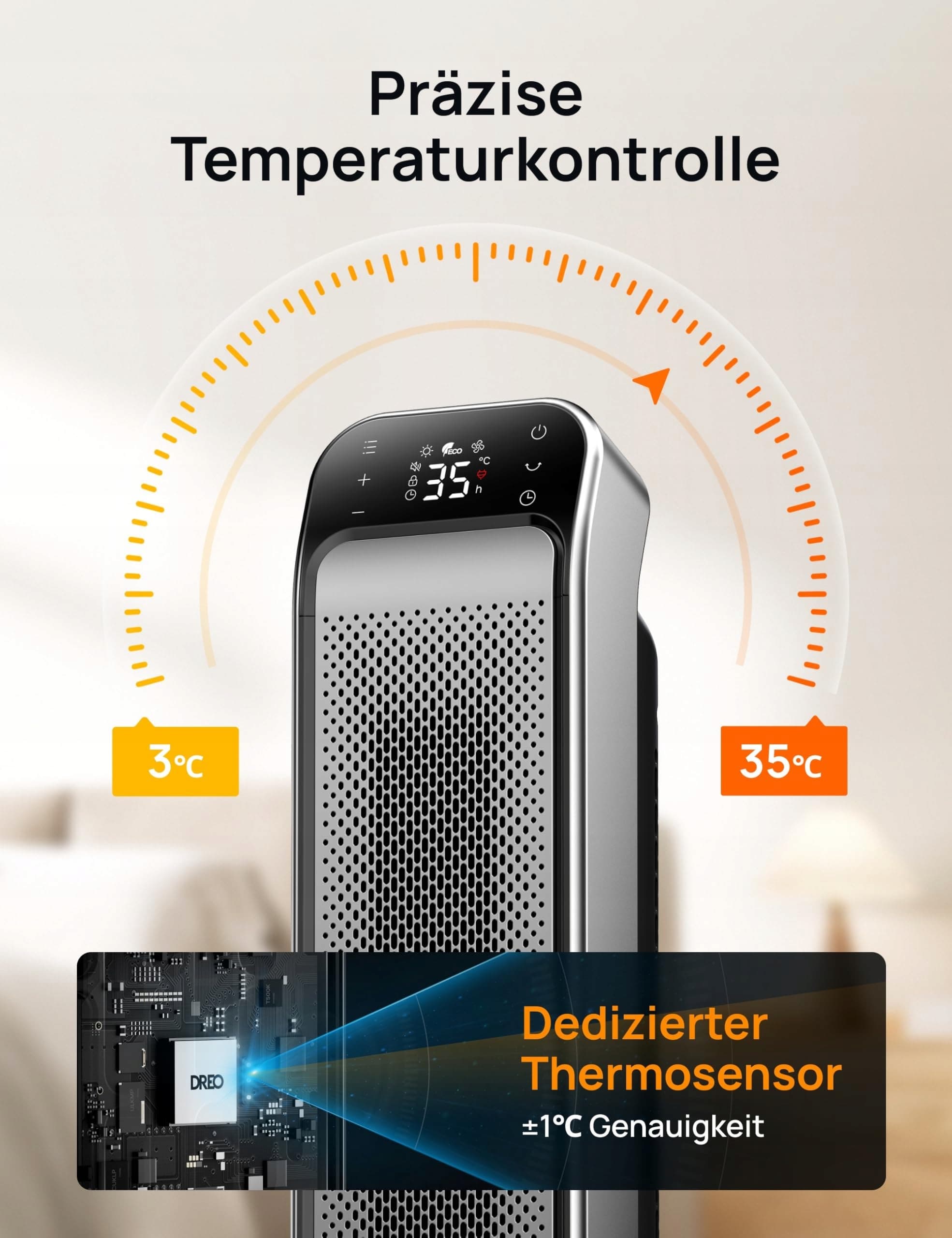 Precyzyjna kontrola temperatury: Ustaw temperaturę w pomieszczeniu z niespotykaną dotąd precyzją. Ten grzejnik z termostatem używa specjalnego czujnika temperatury do pomiaru temperatury w pomieszczeniu i automatycznie dostosowuje grzanie w trybie ECO. Temperatura może być ustawiona w zakresie od 5 do 35 °C (41-95 °F) z dokładnością do 1 °F, aby zapewnić optymalny komfort.
