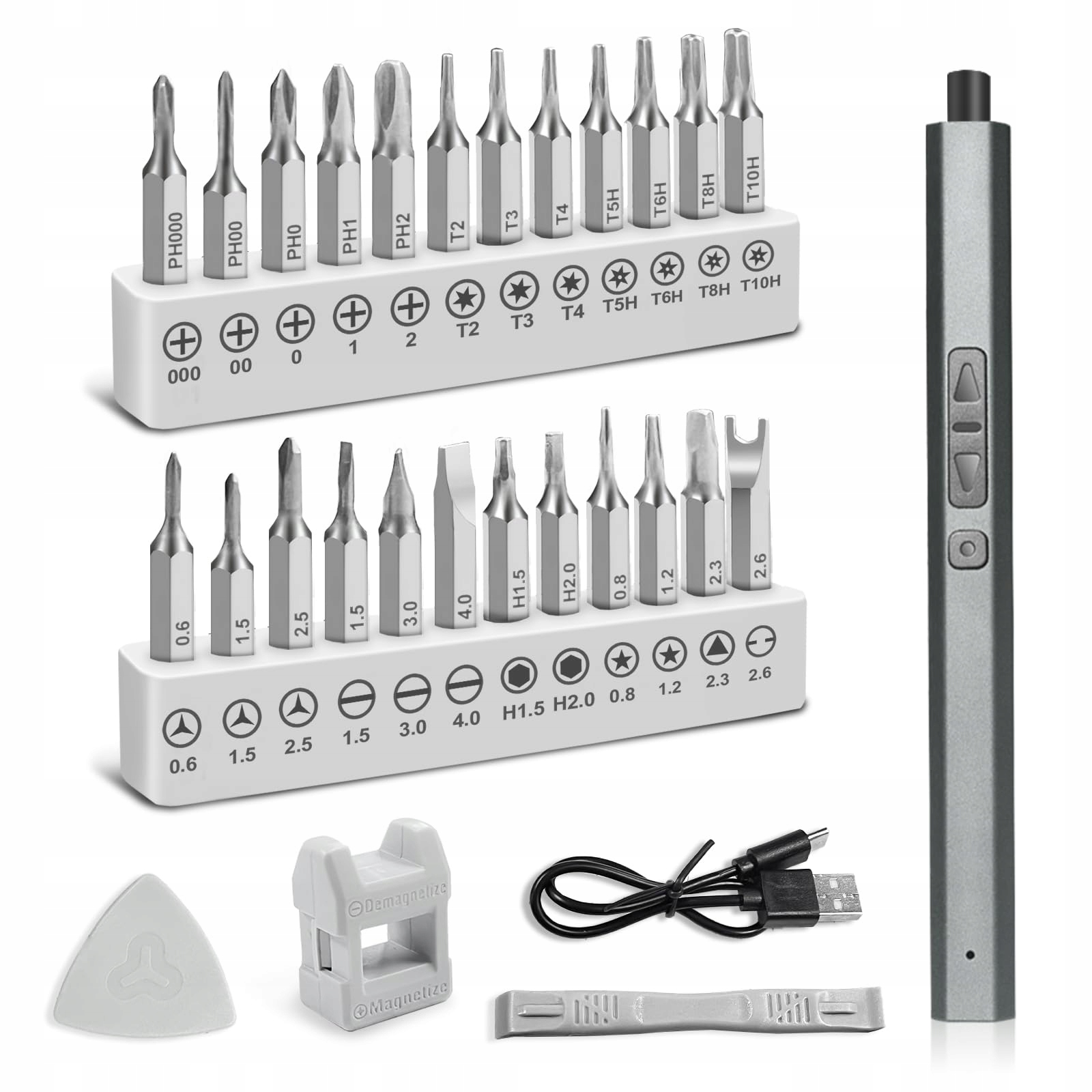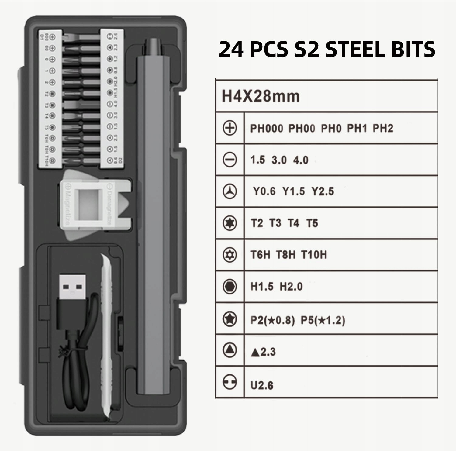 Zestaw elektrycznych wkrętarek precyzyjnych zawiera 30 części: 24*wkładki wkrętakowe precyzyjne, 1*magnetometr, 1*kabel USB. Różnorodność końcówek wkrętakowych w różnych rozmiarach może łatwo zaspokoić różne potrzeby. Odpowiedni do zegarków, okularów, Maca, PC, zegarków, zabawek, okularów, PS4, dronów, elektroniki itp.