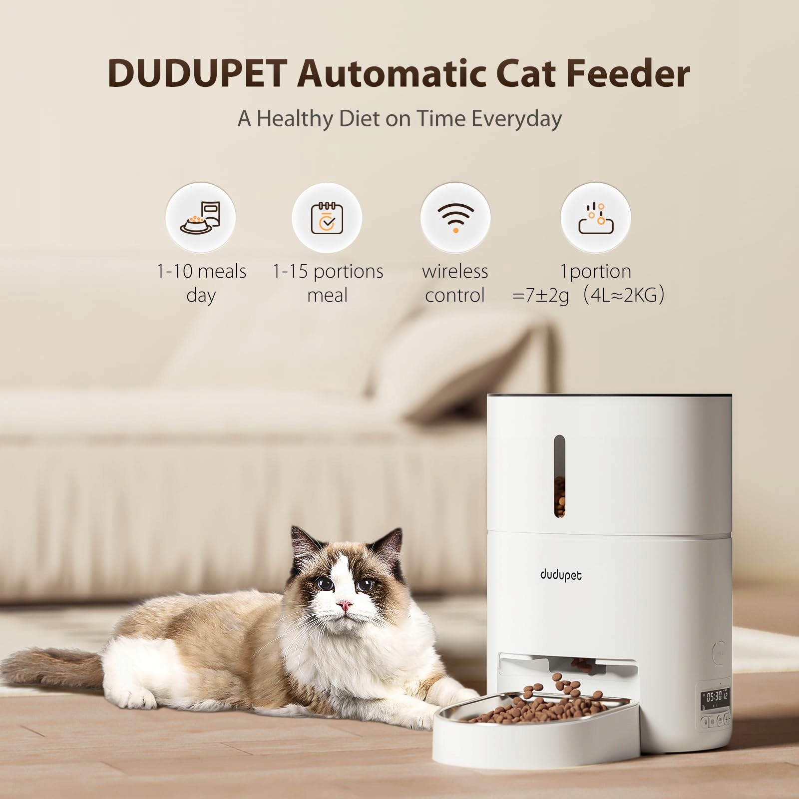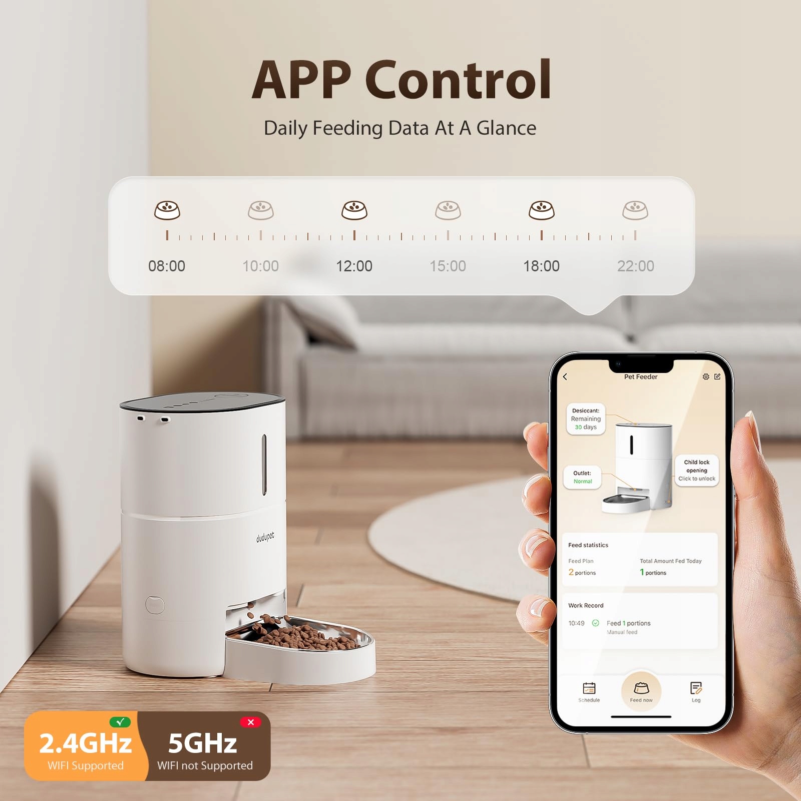 [Sterowanie WLAN 2,4 GHz]: Automat do karmienia DUDUPET dla kotów obsługuje zdalne sterowanie 2,4 G WIFI. Aplikacja jest bardzo prosta i intuicyjna, a także pozwala na śledzenie karmienia. Dzięki temu można karmić swojego pupila wszędzie i rejestrować karmienia.