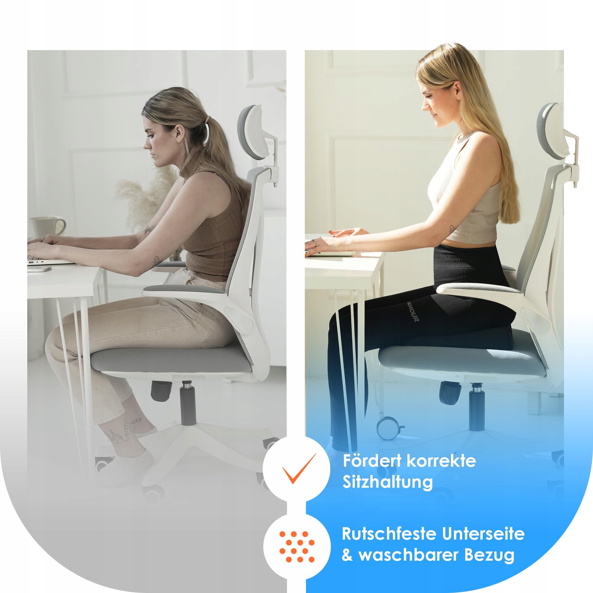 Twój antypoślizgowy klin siedzący o idealnej twardości: Dzięki naszym pilnym testerom stworzyliśmy idealną twardość dla poduszki siedzącej do biura z pianki kompozytowej i dodatkowej warstwy pianki! Dzięki sprytnym wypustkom, poduszka na pewno pozostanie tam, gdzie powinna. Stabilna, formowana i niezwykle wygodna - po prostu genialna