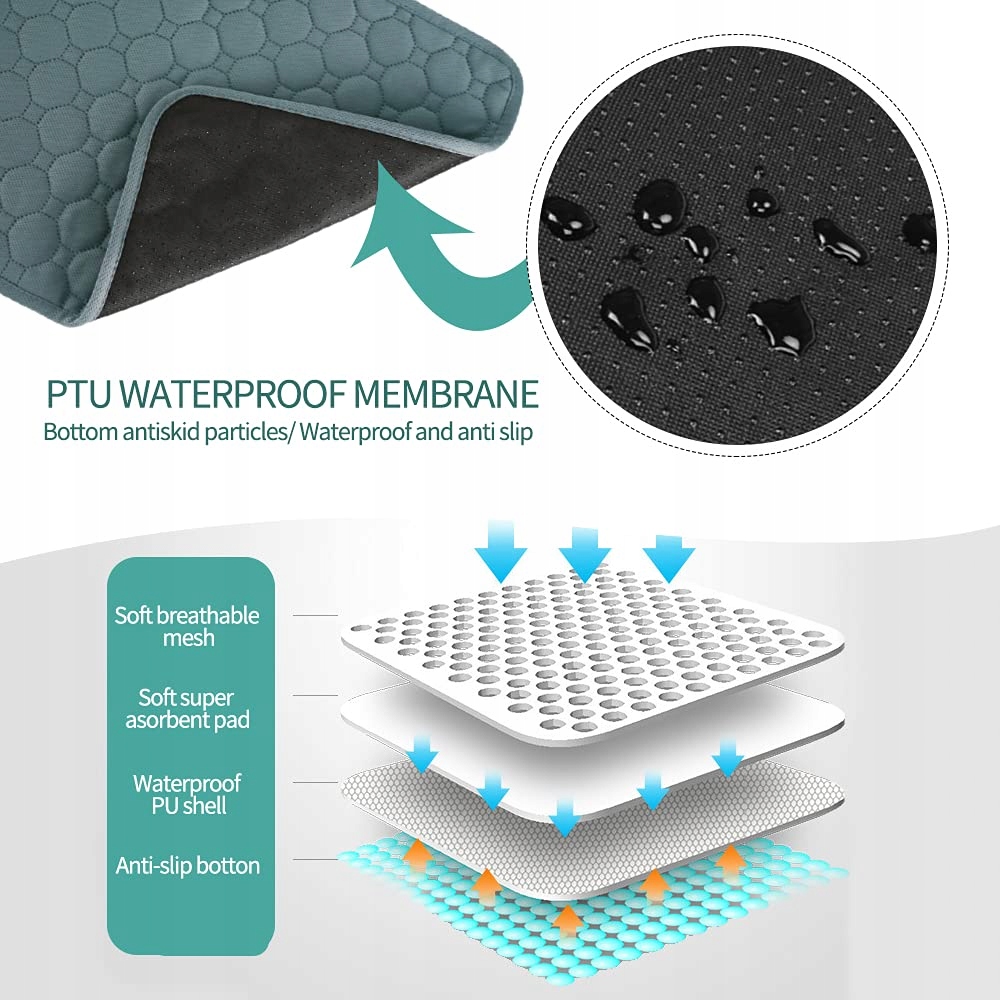 [Wodoszczelny Design]: Wodoodporna tkanina Oxford z antypoślizgowym wzorem. Krawędź podkładki jest dobrze obszyta. Nie martw się, że mocz Twoich zwierząt wycieknie na podłogę lub na siedzenie samochodu. Na spodzie podkładki znajduje się wodoszczelna dolna warstwa z gumowymi wypustkami, aby zapobiec przesuwaniu się po podłodze.